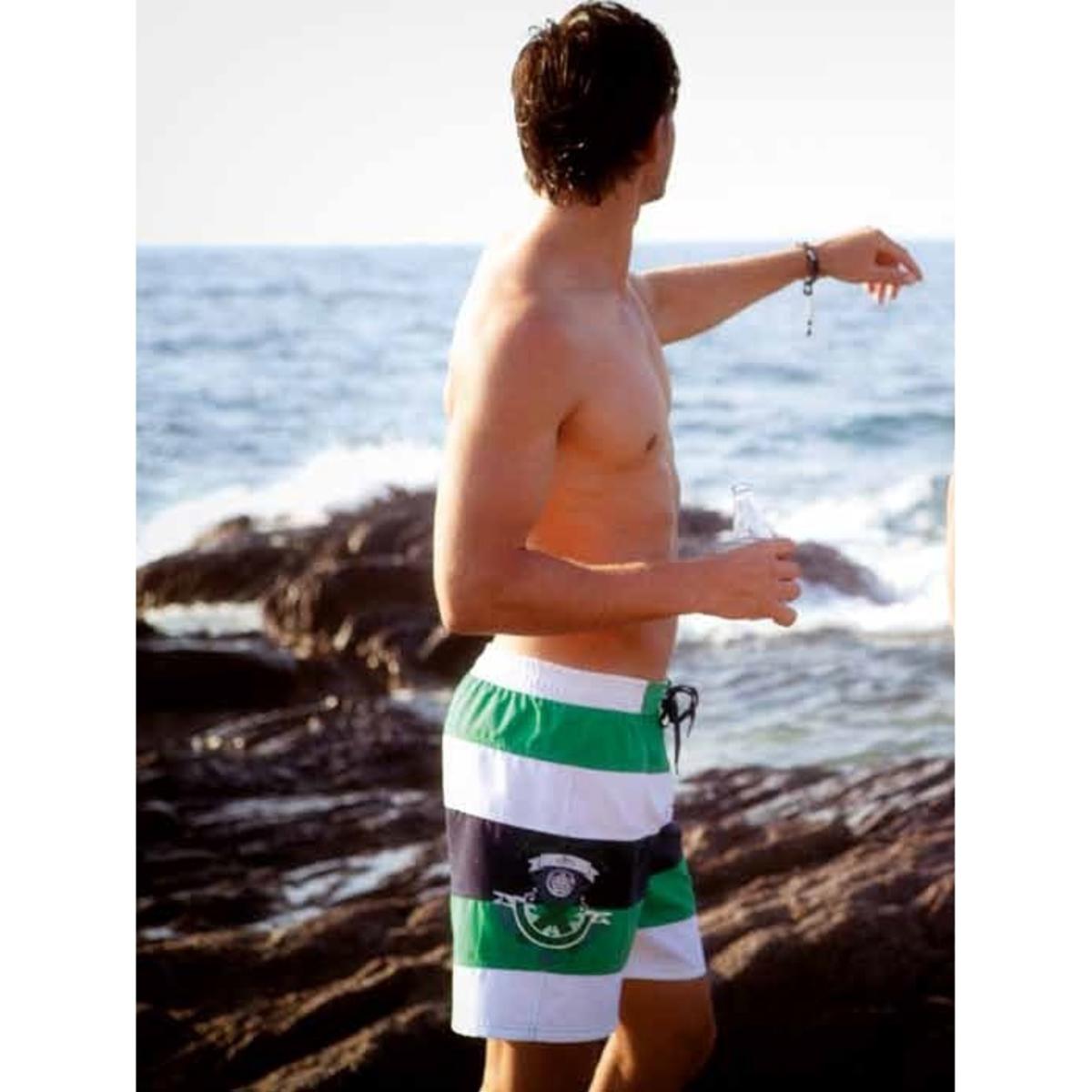 Модные плавательные шорты на широком поясе с кулиской. Модель имеет удобный боковой карман с клапаном сбоку. Яркая расцветка в полоску отлично подходит под любую футболку.