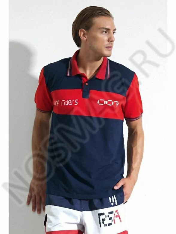 Мужская футболка-поло, выполненная в спортивном стиле и украшенная модным принтом. Рукава и воротник подчёркнуты акцентирующим многоцветным кантом.