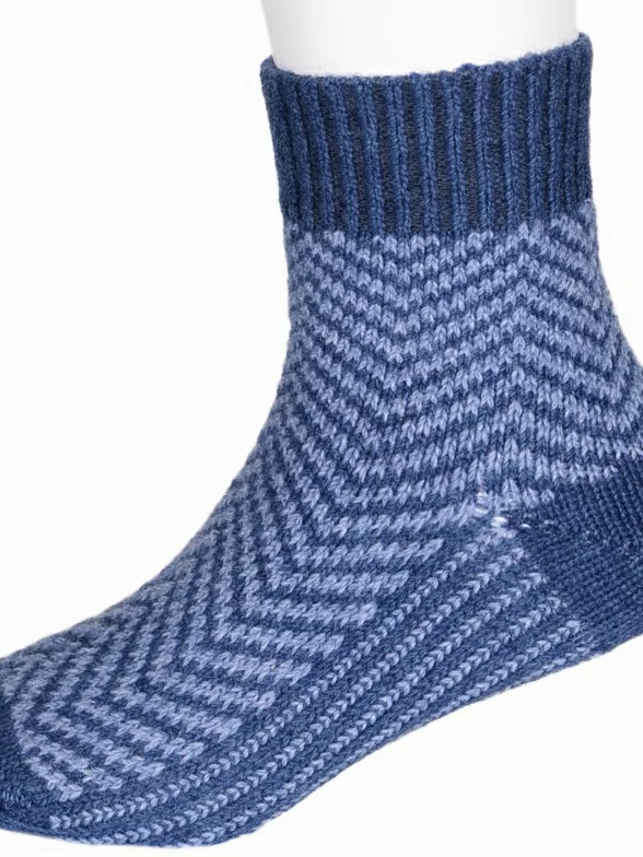 Зимние средней длины детские носки, цвет синий-джинс, теплые, классические, шов обычный (не бесшовные), принт (рисунок): елочка / гусиная лапка, с узором, состав: 28% шерсть, 62% акрил, 10% полиамид, арт. Д-382. Производитель «ООО Орудьевский трикотаж, Россия» под брендом «Rusocks (орудьевский трикотаж)».