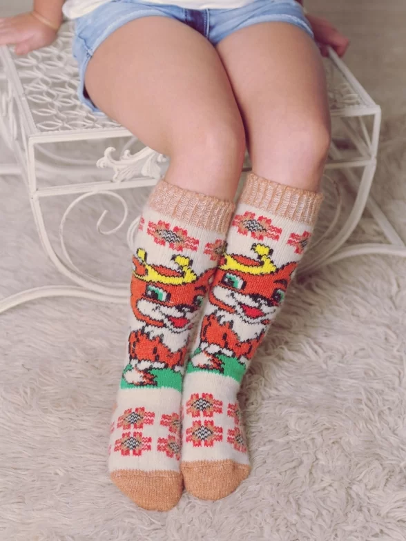Бабушкины носки изготовлены из мягкой новозеландской овечьей шерсти, козьей шерсти и шерсти мериносов. В состав пряжи включено небольшое количество полиамида, который делает носки прочнее Для производства используются итальянские станки BUSI GIOVANNI. Модель выполнена в ярких цветах и украшена красивыми узорами и изображением лисенка в короне.