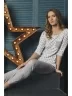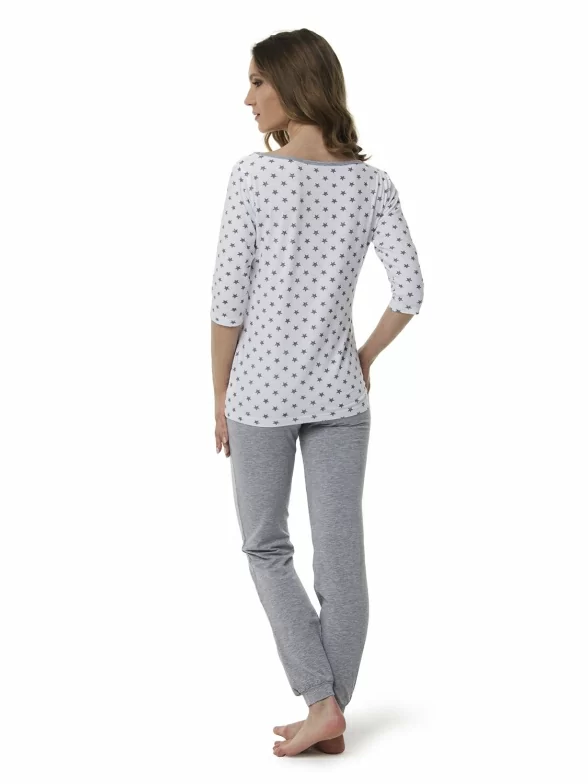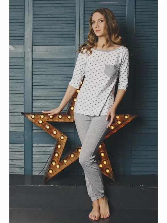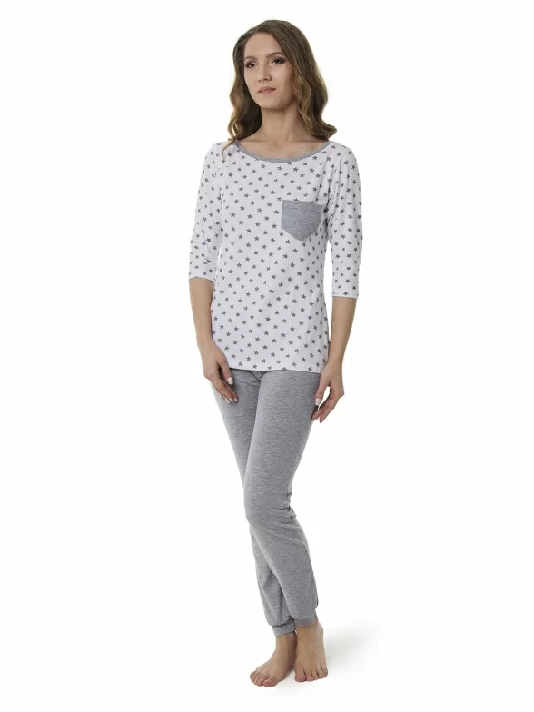 Женский комплект для дома. Верх – джемпер с рукавом 3/4, широким вырезом-лодочкой и контрастным нагрудным карманом оформлен принтом со звездами. Однотонные брюки на эластичном поясе дополнены плотными манжетами.