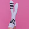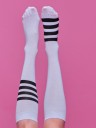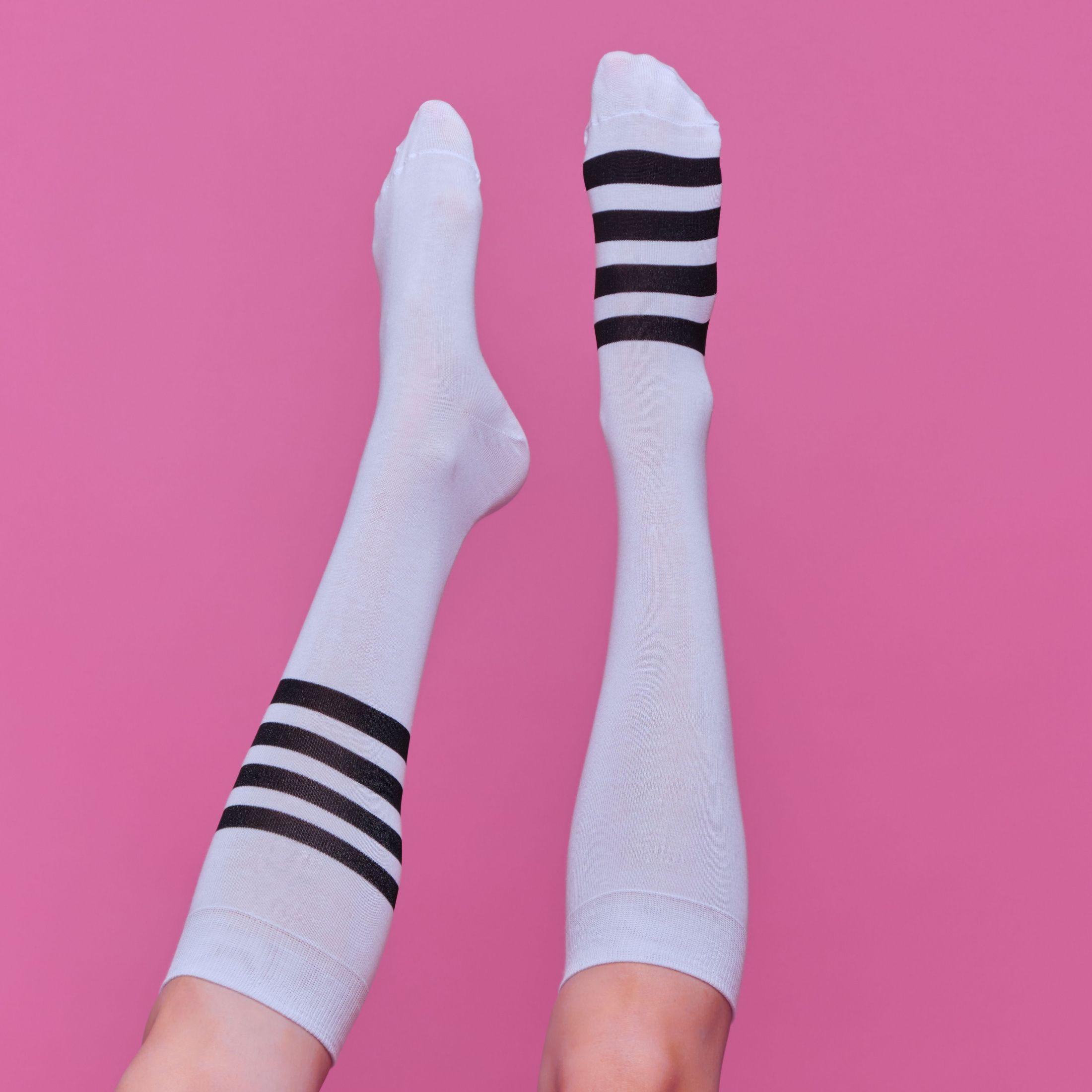 Модель длиной почти до колена с двойным бортом (манжетом резинки) и ощутимым уплотнением в месте шва на мыске. Пара таких гольфов белого цвета поставляется с фабричной этикеткой в обычном или курьер-пакете.