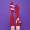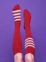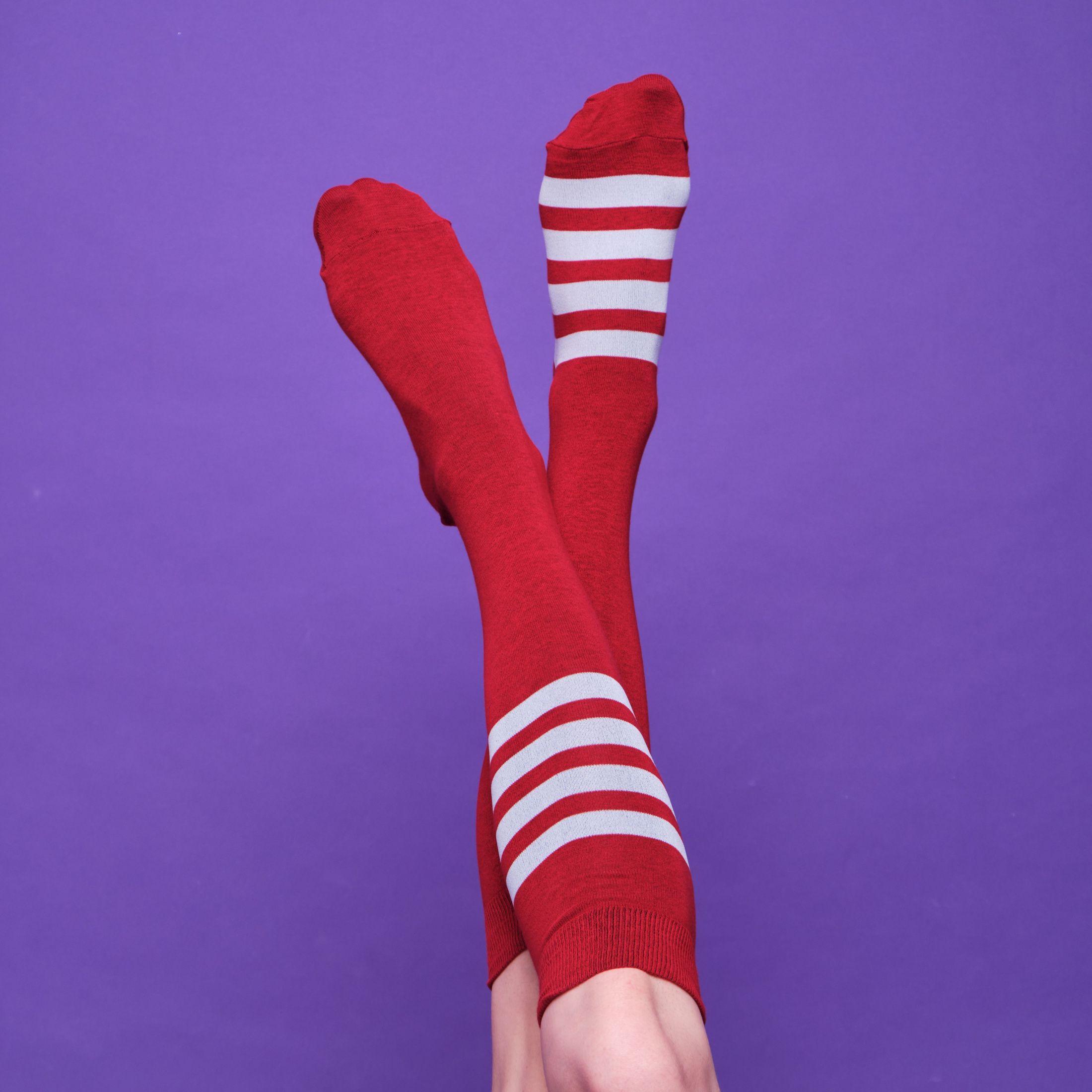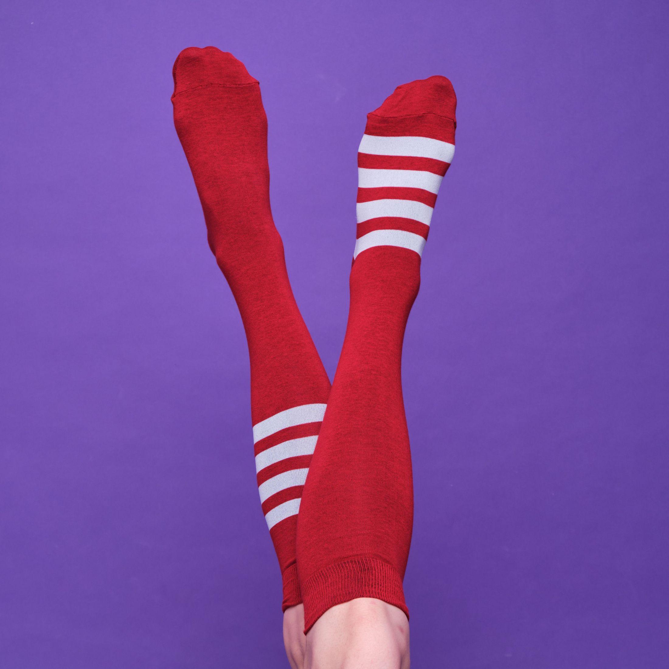 Модель длиной почти до колена с двойным бортом (манжетом резинки) и ощутимым уплотнением в месте шва на мыске. Пара таких гольфов красного цвета поставляется с фабричной этикеткой в обычном или курьер-пакете.