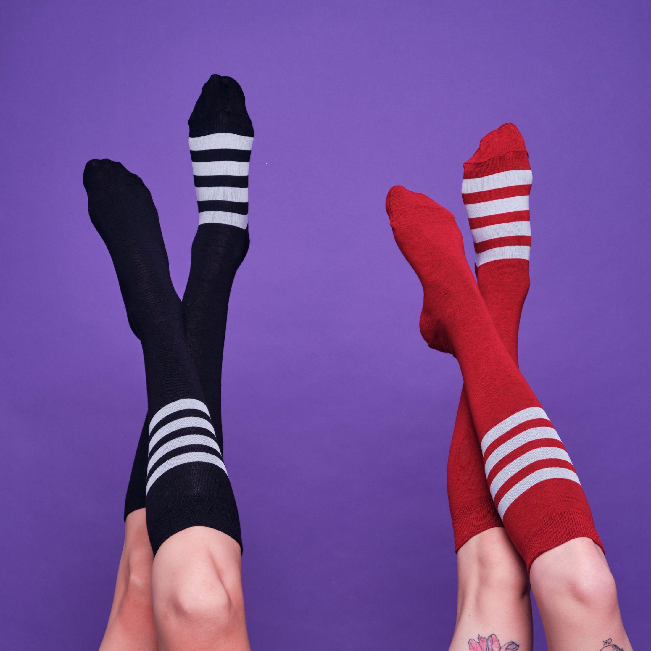 Гольфы унисекс "Танцующие звезды" с принтом в виде контрастных полос, расположенных несимметрично на разных гольфах в паре.
