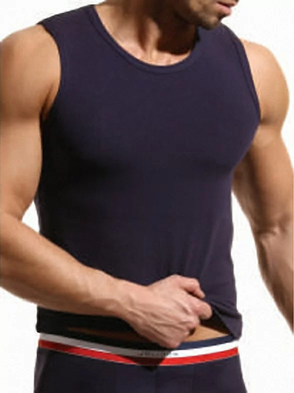 Однотонная мужская майка на широких бретелях .Модель облегающего кроя. Майка изготовлена из высококачественного трикотажа с высоким содержанием натурального хлопка.