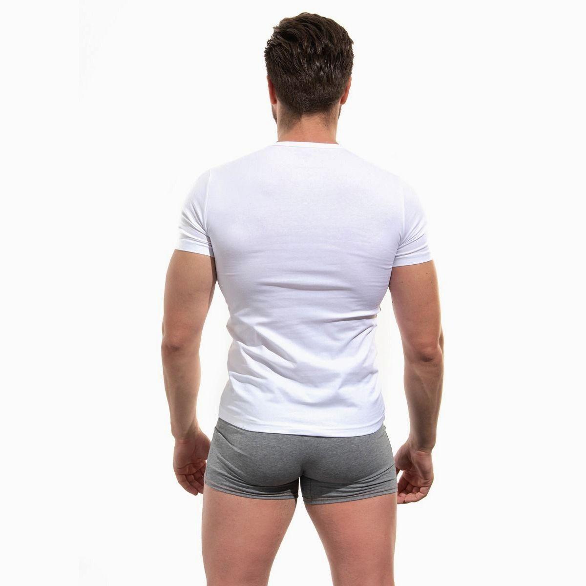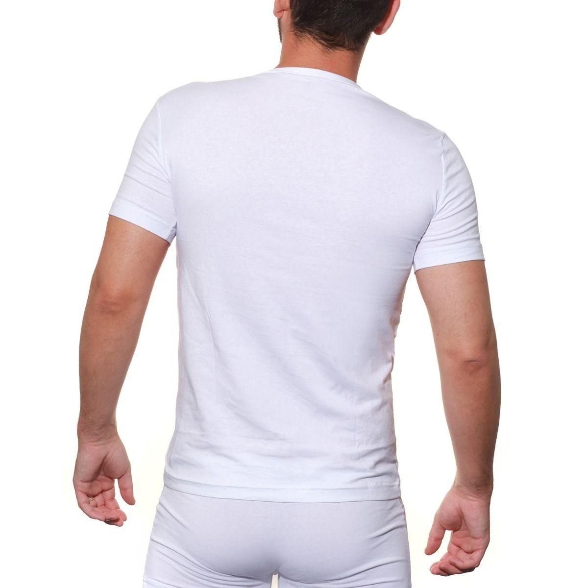 Однотонная мужская белая футболка с коротким рукавом. Закругленный V-образный вырез горловины с рельефной окантовкой смотрится очень интересно. Майка сделана из приятного трикотажа на основе натурального хлопка.