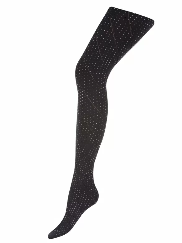 Стильные колготки в горошек с тонкими диагональными линиями по всей длине ног, подойдут для создания любого образа. Для большего удобства модель имеет широкий эластичный пояс, плоские швы и х/б ластовица.