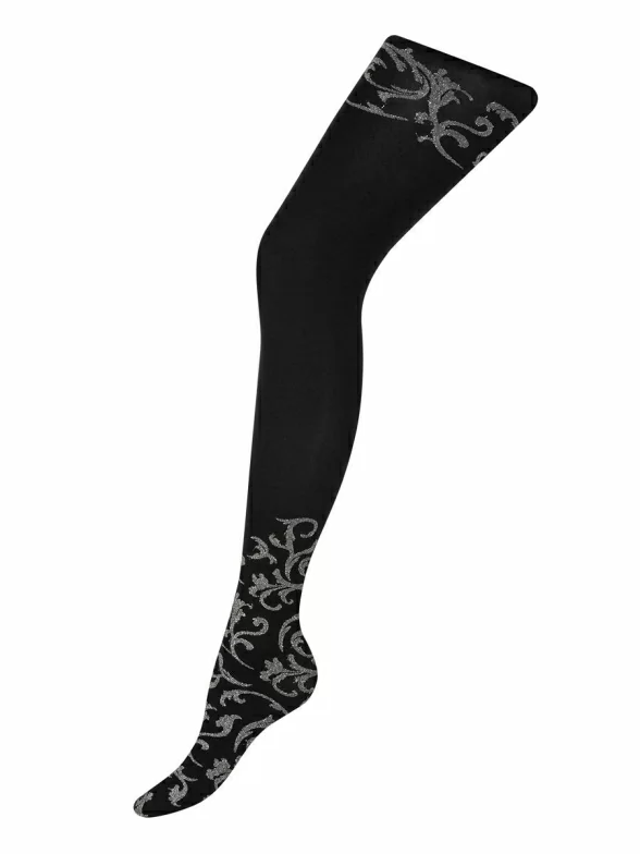 Красивые матовые колготки с фрагментарным рисунком люрексом, напоминающим морозных узорах на стекле. Для большего комфорта модель имеет плоские швы, укреплённые носочки и х/б ластовицу.