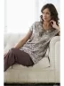 Удобная и стильная пижама для женщин сделана из искусственного шелка. Свободная блуза, украшенная кружевной тесьмой и планкой с пуговицами, изготовлена из текстиля с принтом огурцы, длинные брюки — из однотонного атласа.
