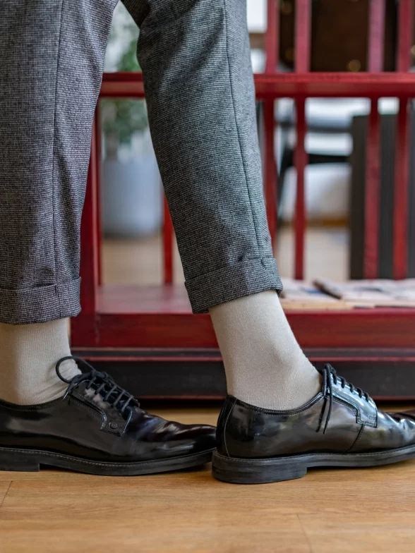 Однотонная модель средней длины с одинарным бортом (манжетом резинки) и неощутимым швом на мыске. Изготовлены на фабрике "Орудьевский трикотаж" в Московской области из хлопка с добавлением полиамида и эластана для износостойкости изделия и комфортной посадки.