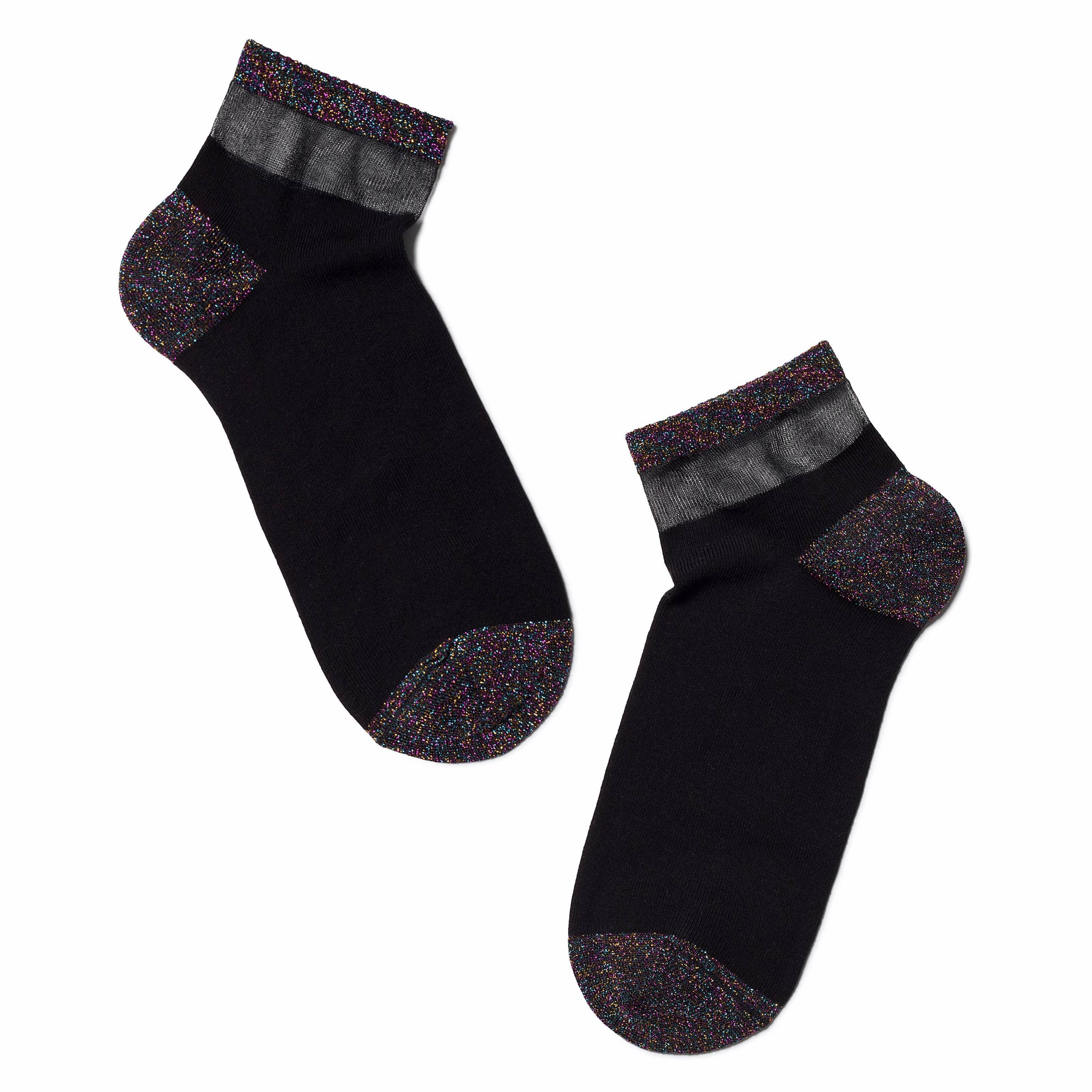 Укороченная модель с двойным бортом (манжетом резинки) и неощутимым швом на мыске; украшена полупрозрачной вставкой на паголенке и блестящей нитью, которая дает эффект мерцания. Связаны на фабрике в Беларуси из хлопка с добавлением полиамида, полиэстера и эластана для износостойкости изделия и комфортной посадки.