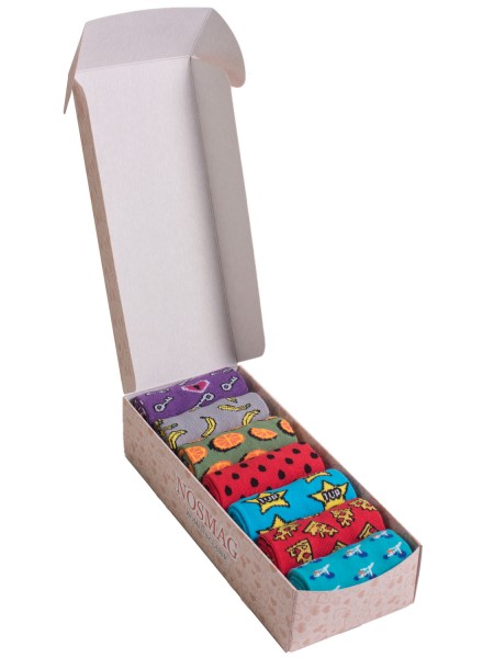 Набор носков от Pe.Chitto упакован в картонную коробку с прозрачным окошком. В набор входит три пары носков, две из которых украшены принтом в виде сов, еще одна декорирована принтом горох. Носки связаны из пряжи на основе хлопка.