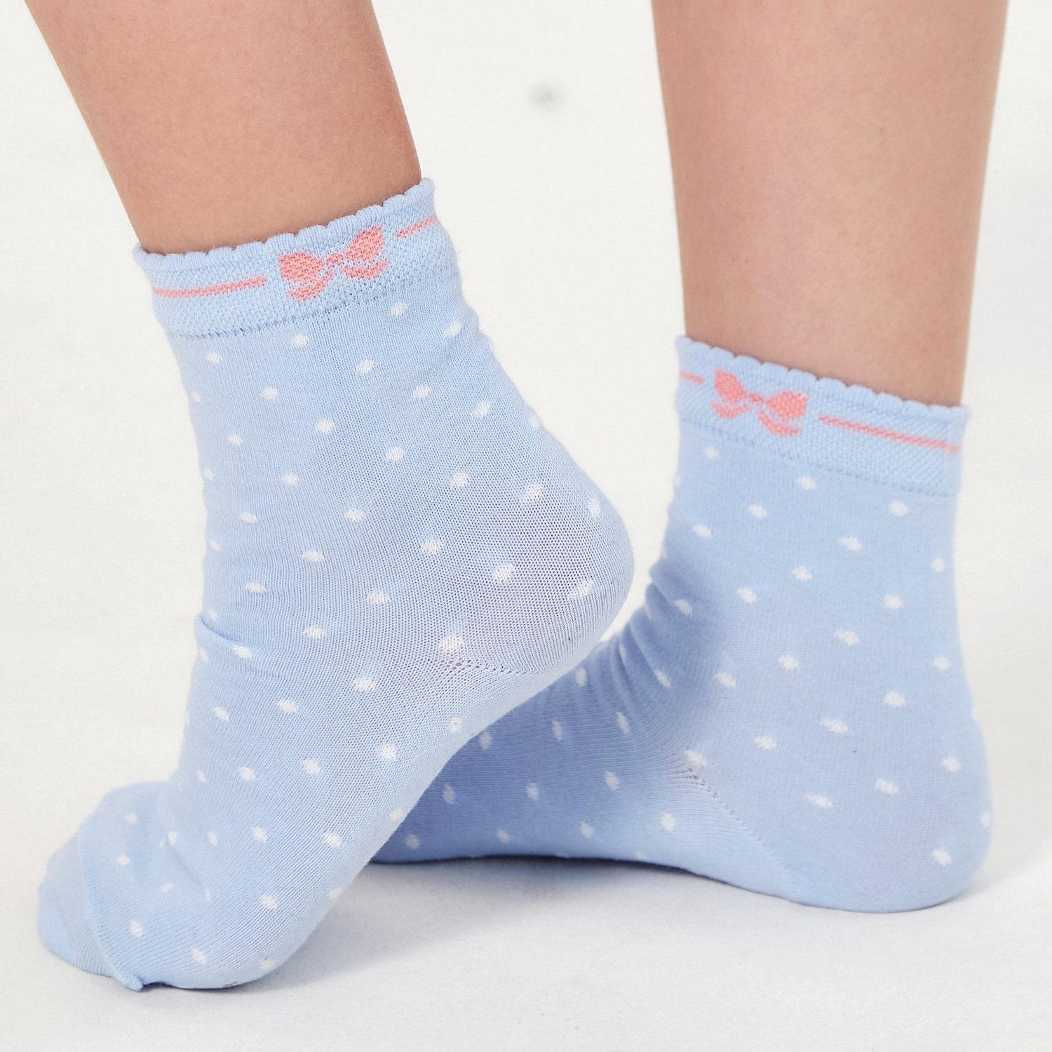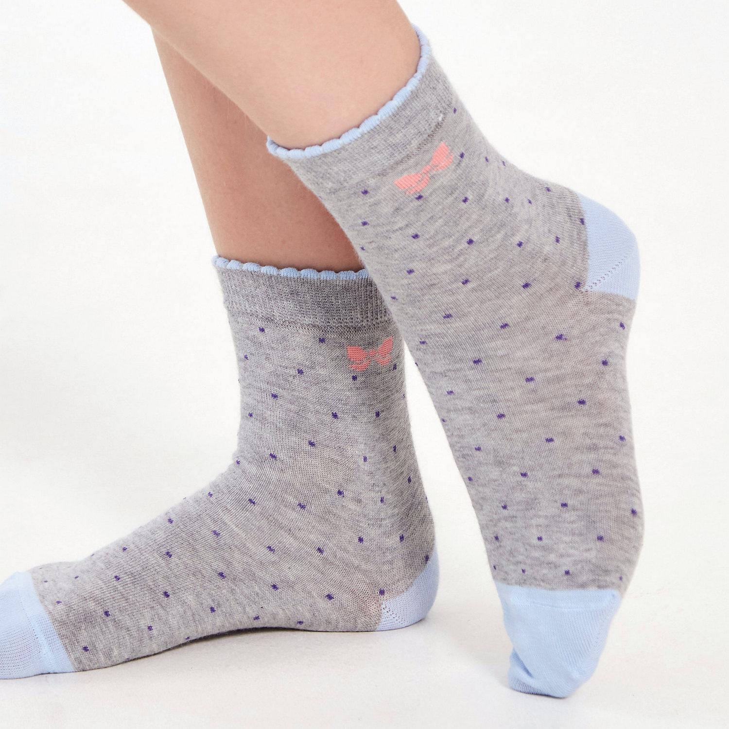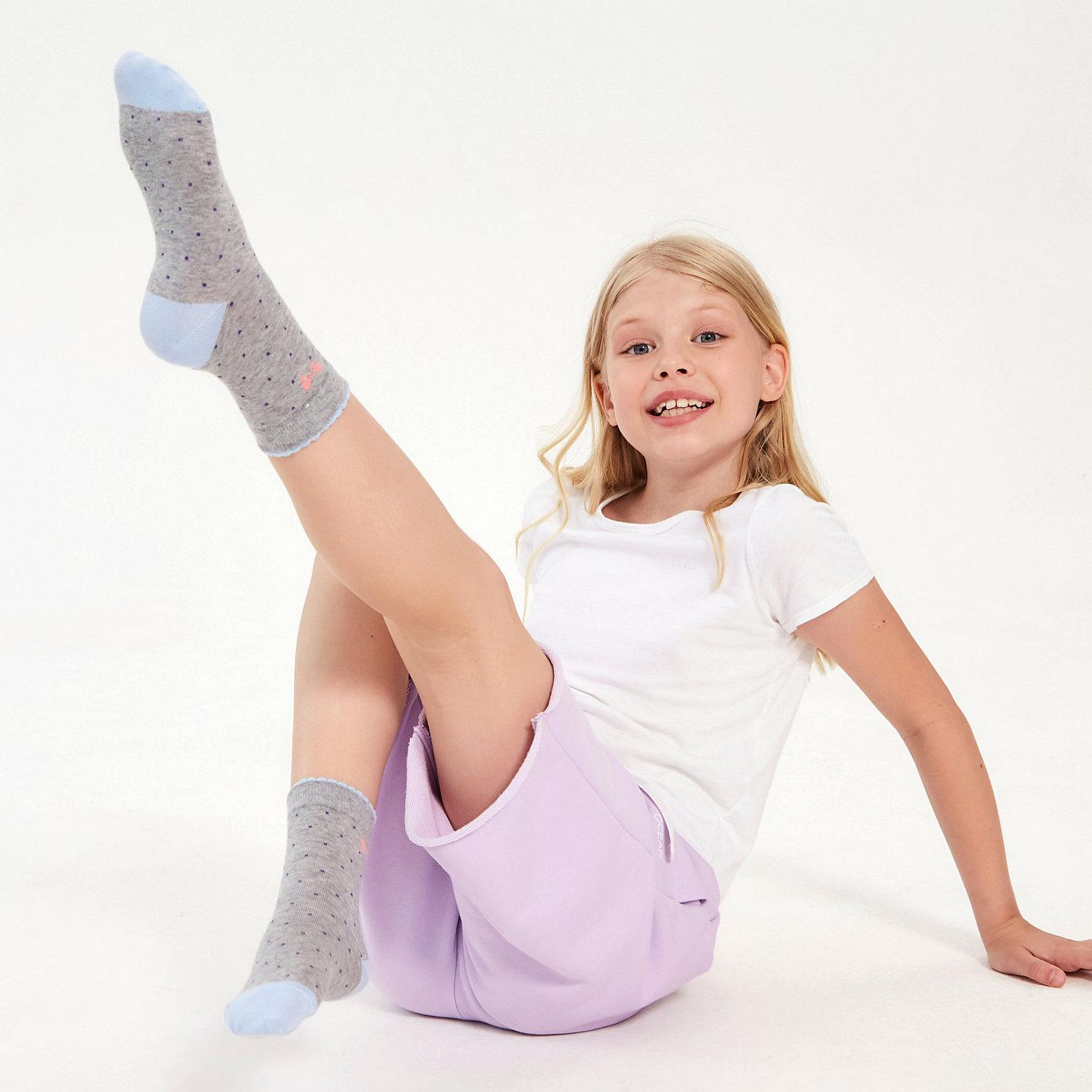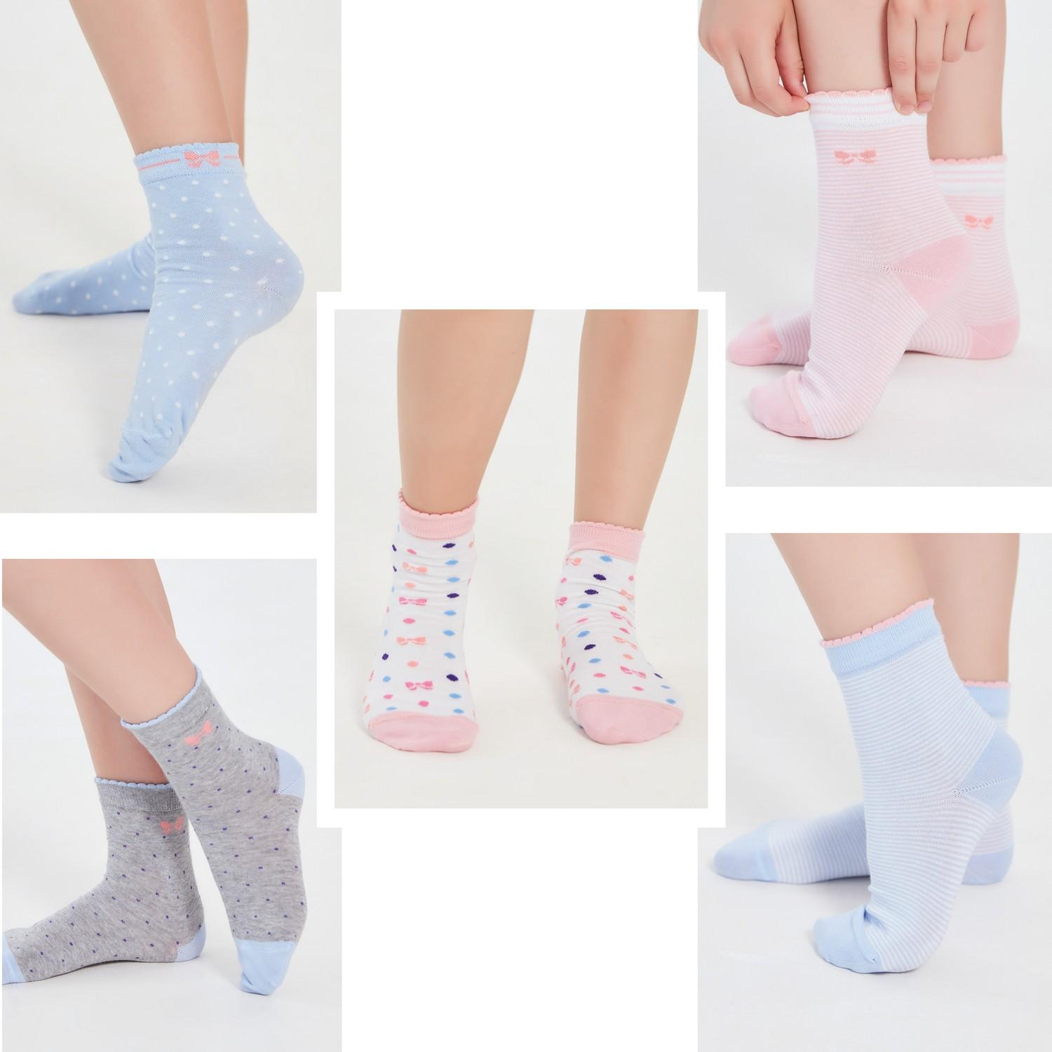 В комплект входит 5 пар носков артикула Л105 разных цветов: по 1 паре голубых и розовых в полоску, бело-розовых, голубых в горошек и серых. Поставляются с индивидуальными фабричными этикетками в обычном или курьер-пакете.