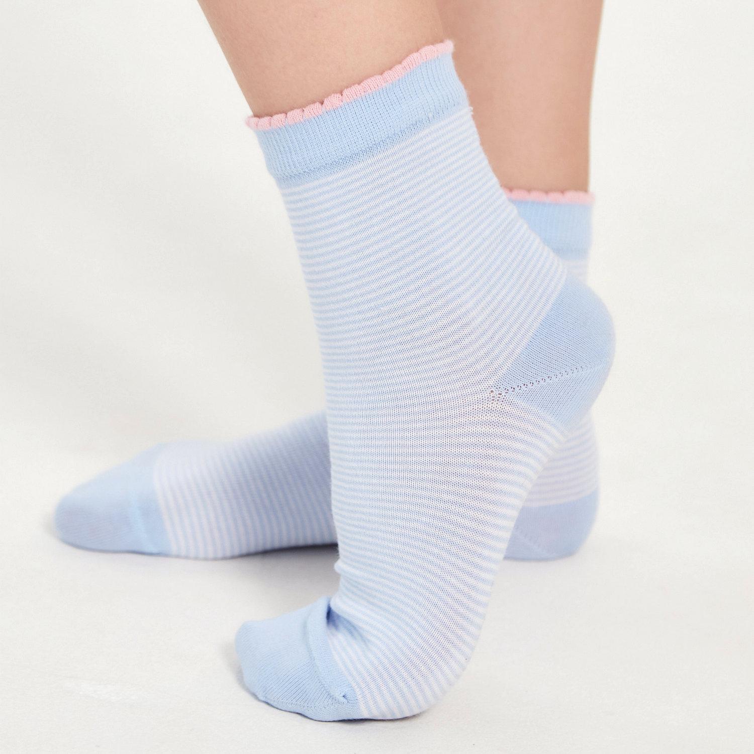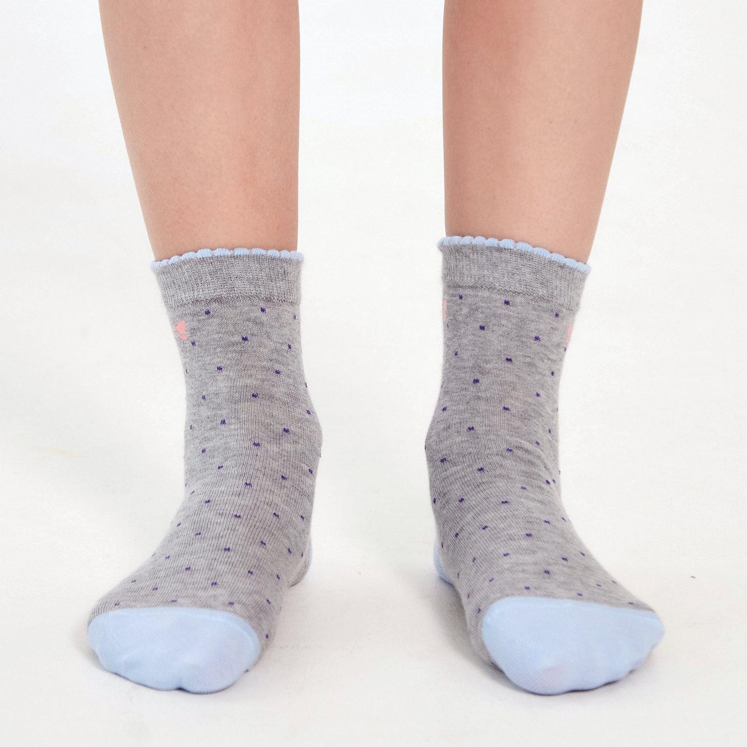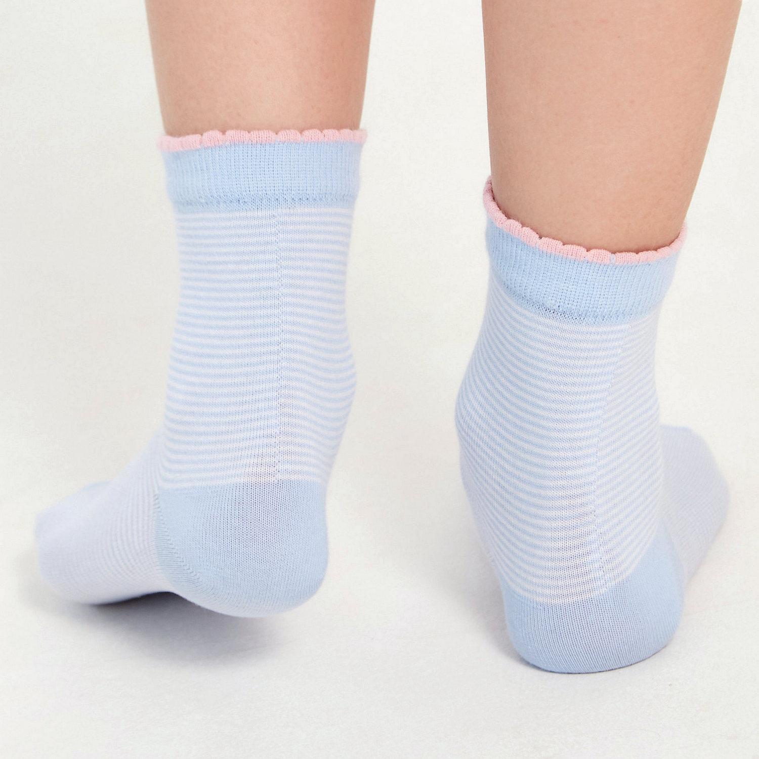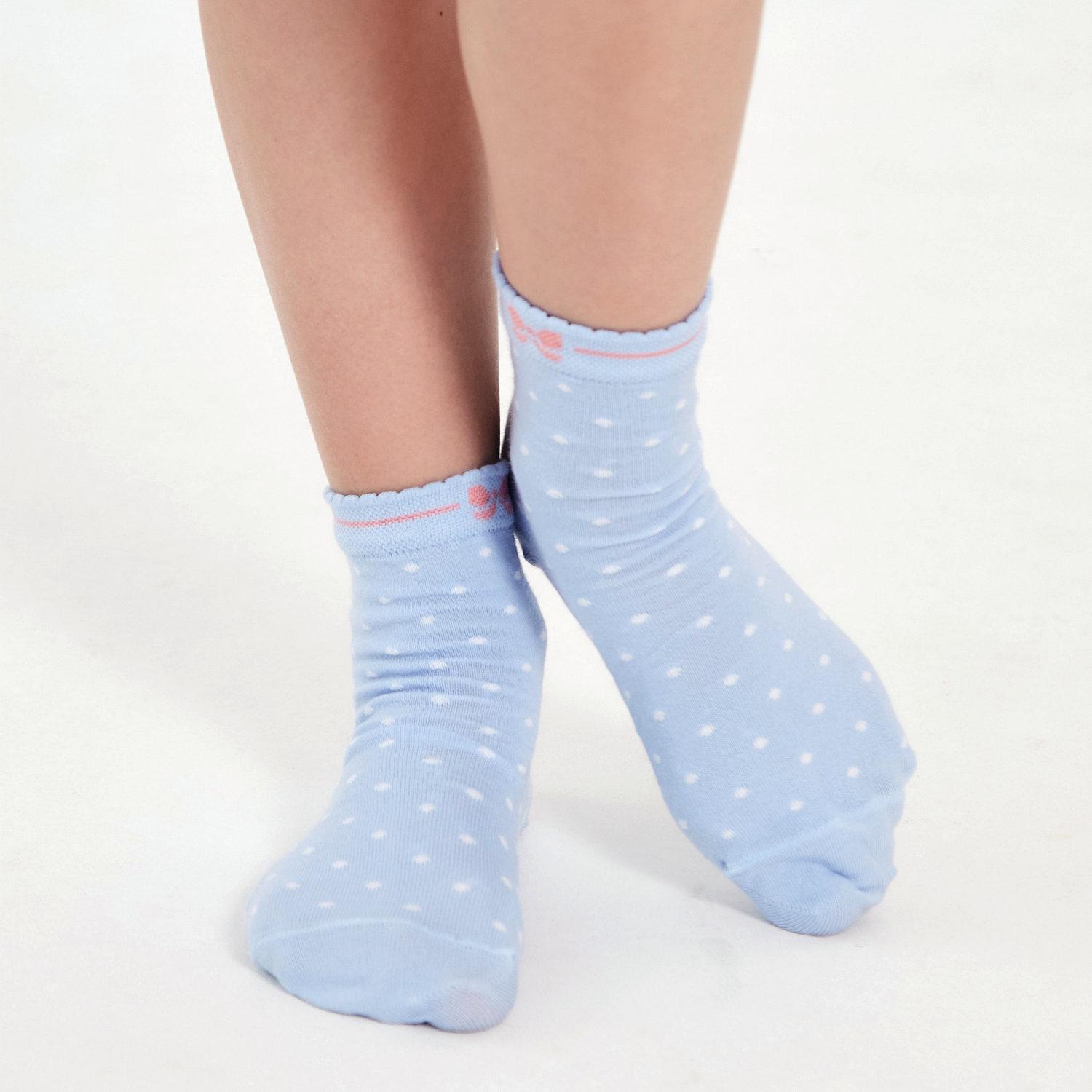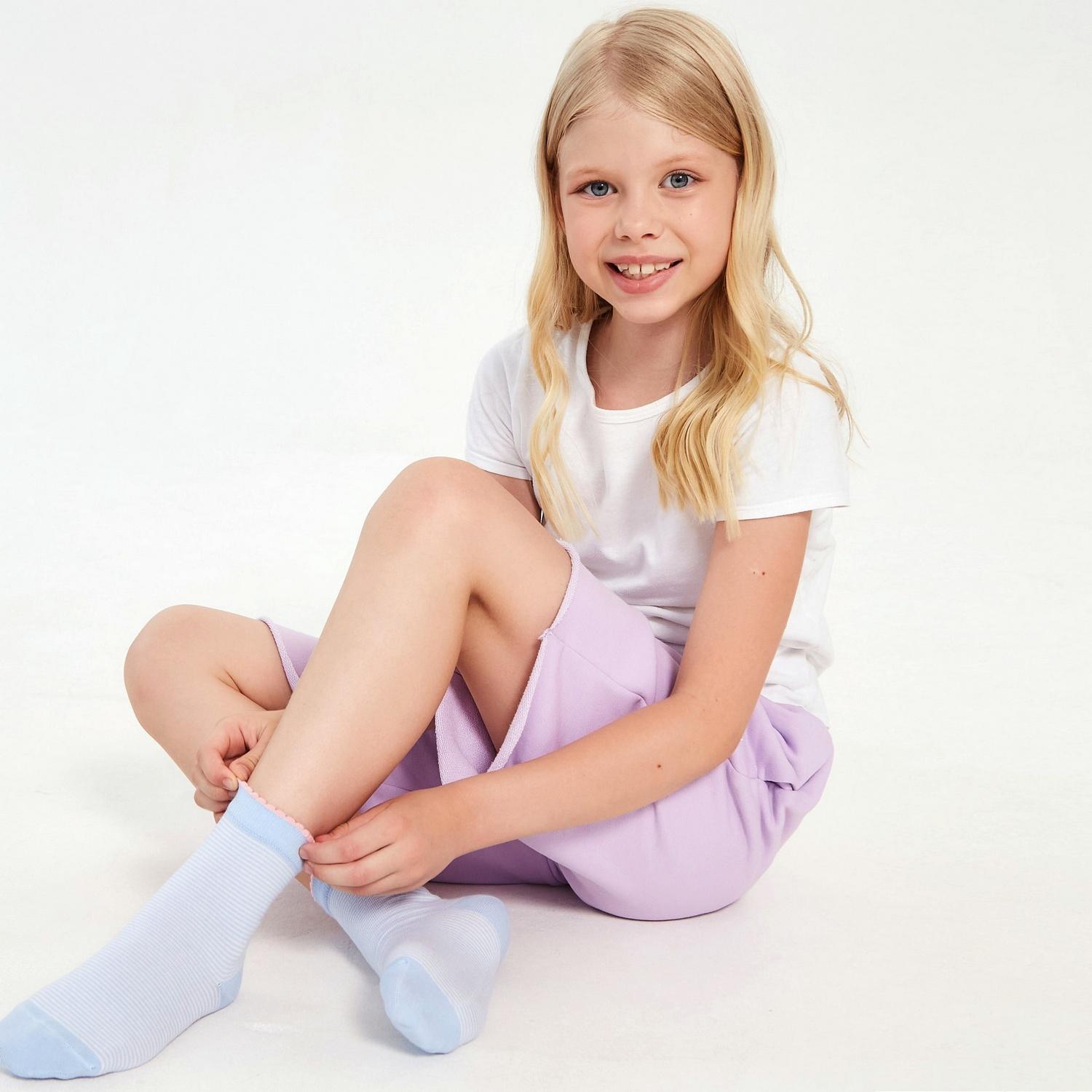 В комплект входит 5 пар носков артикула Л105 разных цветов: по 1 паре голубых и розовых в полоску, бело-розовых, голубых в горошек и серых. Поставляются с индивидуальными фабричными этикетками в обычном или курьер-пакете.