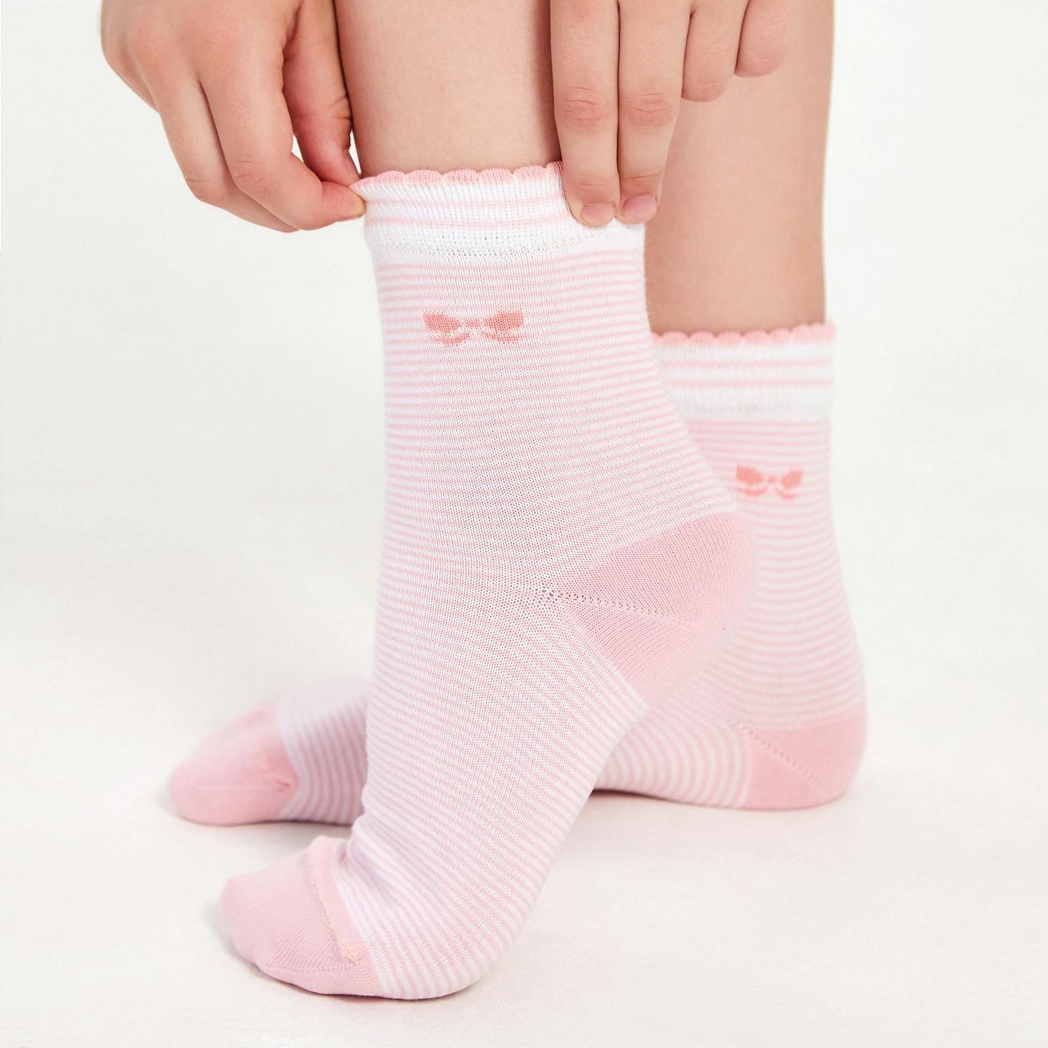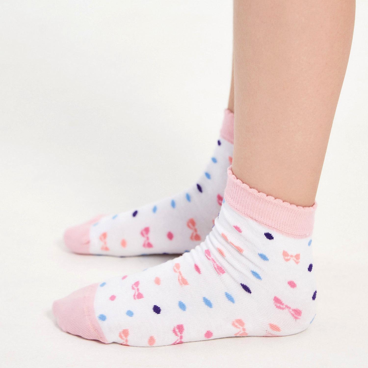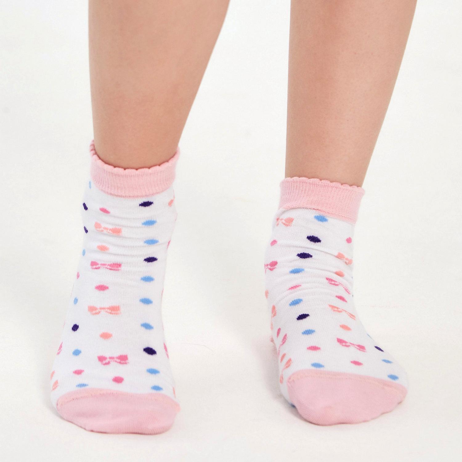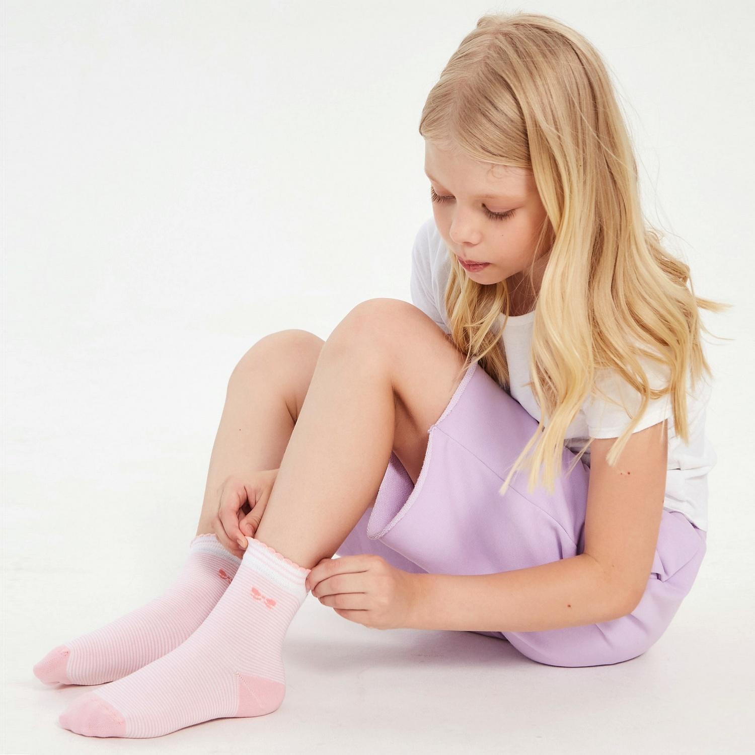 В комплект входит 5 пар носков артикула Л105 разных цветов: по 1 паре голубых и розовых в полоску, бело-розовых, голубых в горошек и серых. Поставляются с индивидуальными фабричными этикетками в обычном или курьер-пакете.