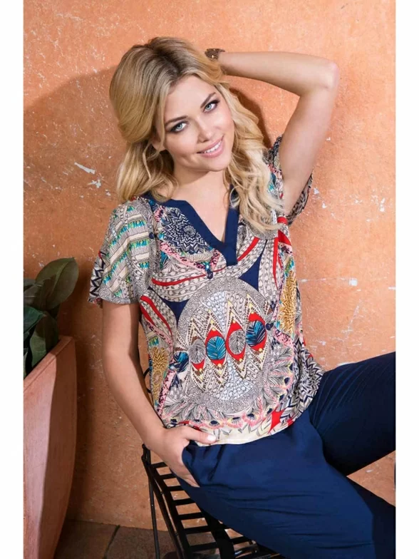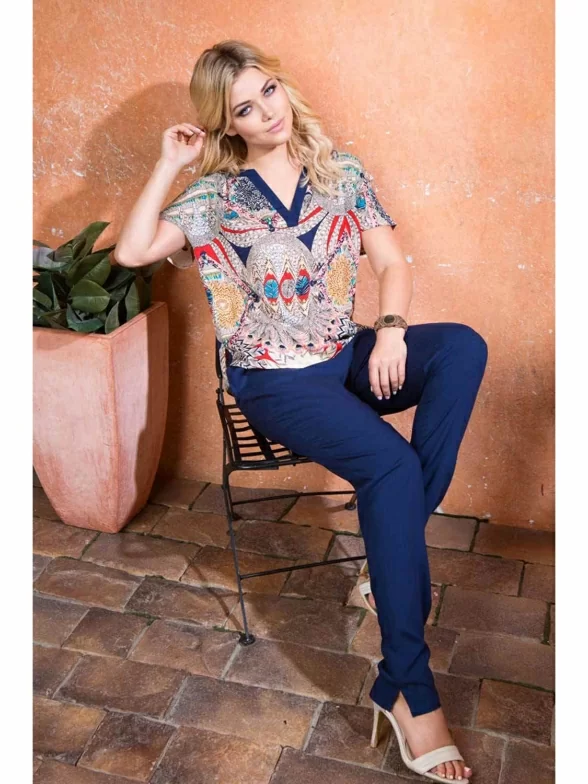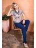Оригинальный женский комплект, состоящий из однотонных брюк и блузы с принтом. Брюки из вискозы отличаются удобными карманами оформлены разрезами внизу. Блуза свободного кроя дарит ощущение прохлады и не сковывает движений.