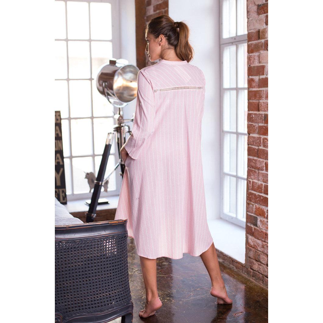 Домашнее женское платье из 100% хлопка. Верх рубашечного кроя с длинным рукавом, коротким воротником и застежкой на пуговицах переходит в расклешенную юбку. Кокетка на полочках и спине, а также планка с пуговицами, декорированы кружевом.