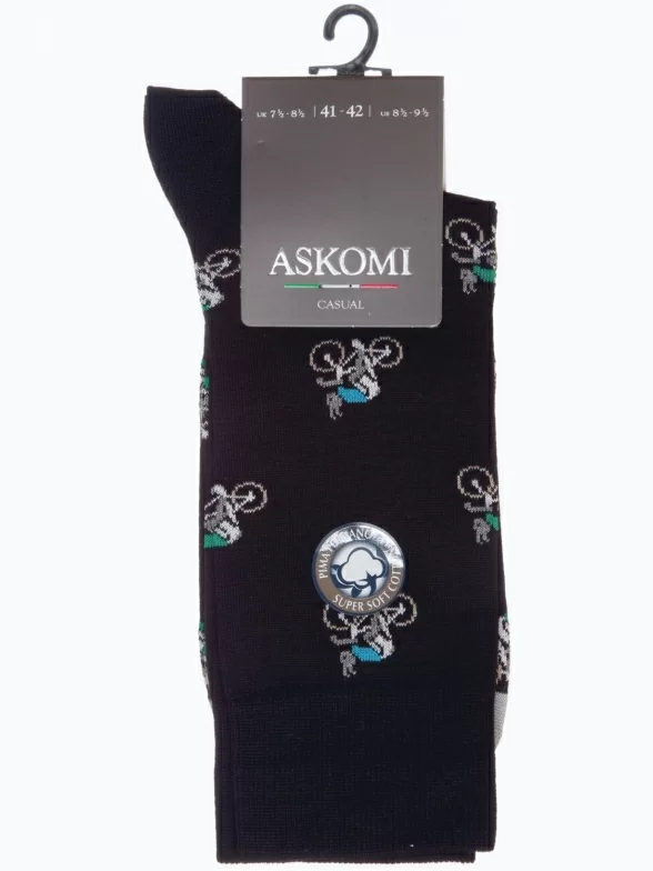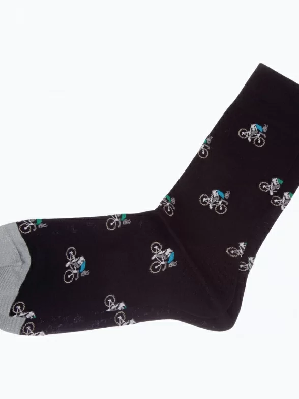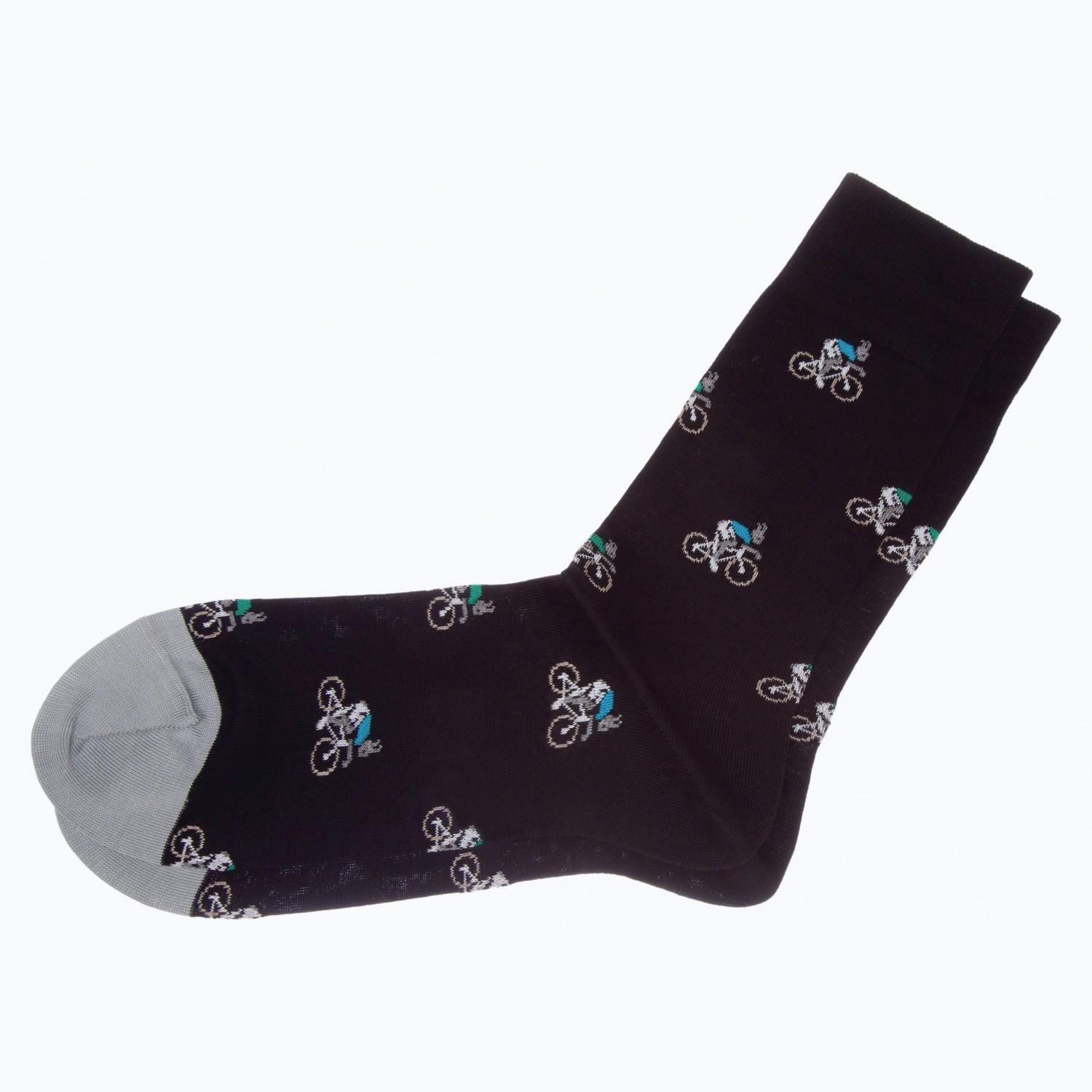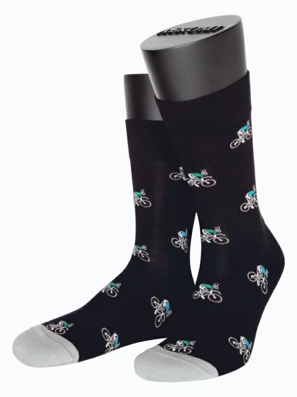 Мужские носки классической длины, произведенные из трикотажа на основе премиального хлопка PIMA по бесшовной технологии. Модель украшена узором с велосипедами и контрастным мыском. Содержание полиамида придает дополнительную износостойкость.