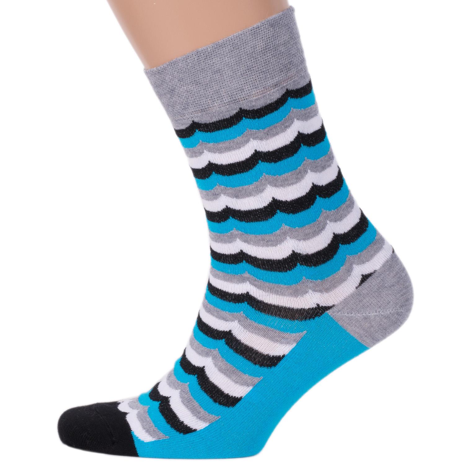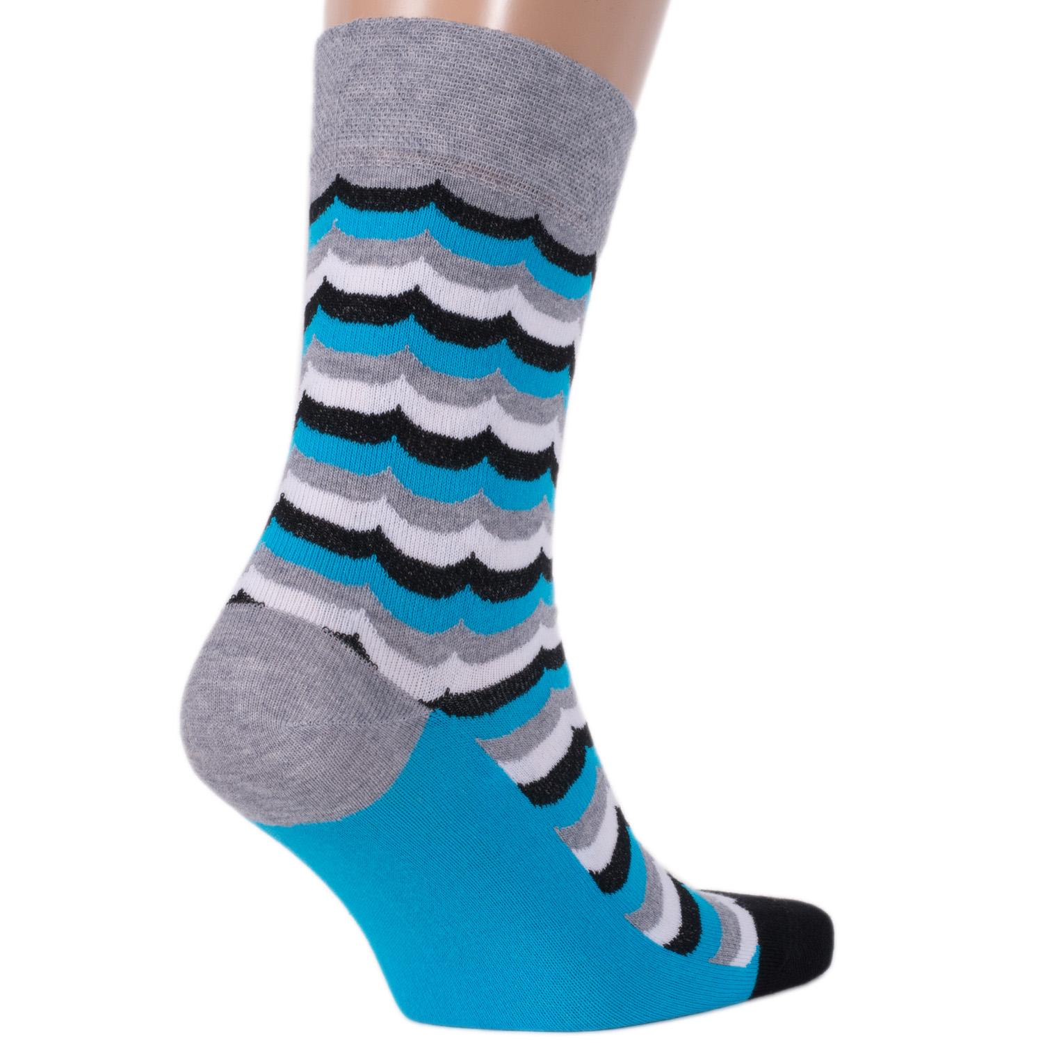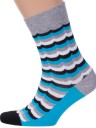 Мужские носки сделаны из хлопка с добавлением полиэстера и эластана. Модель вывязана в волнистую полоску белого, черного и серого цветов на голубом фоне.