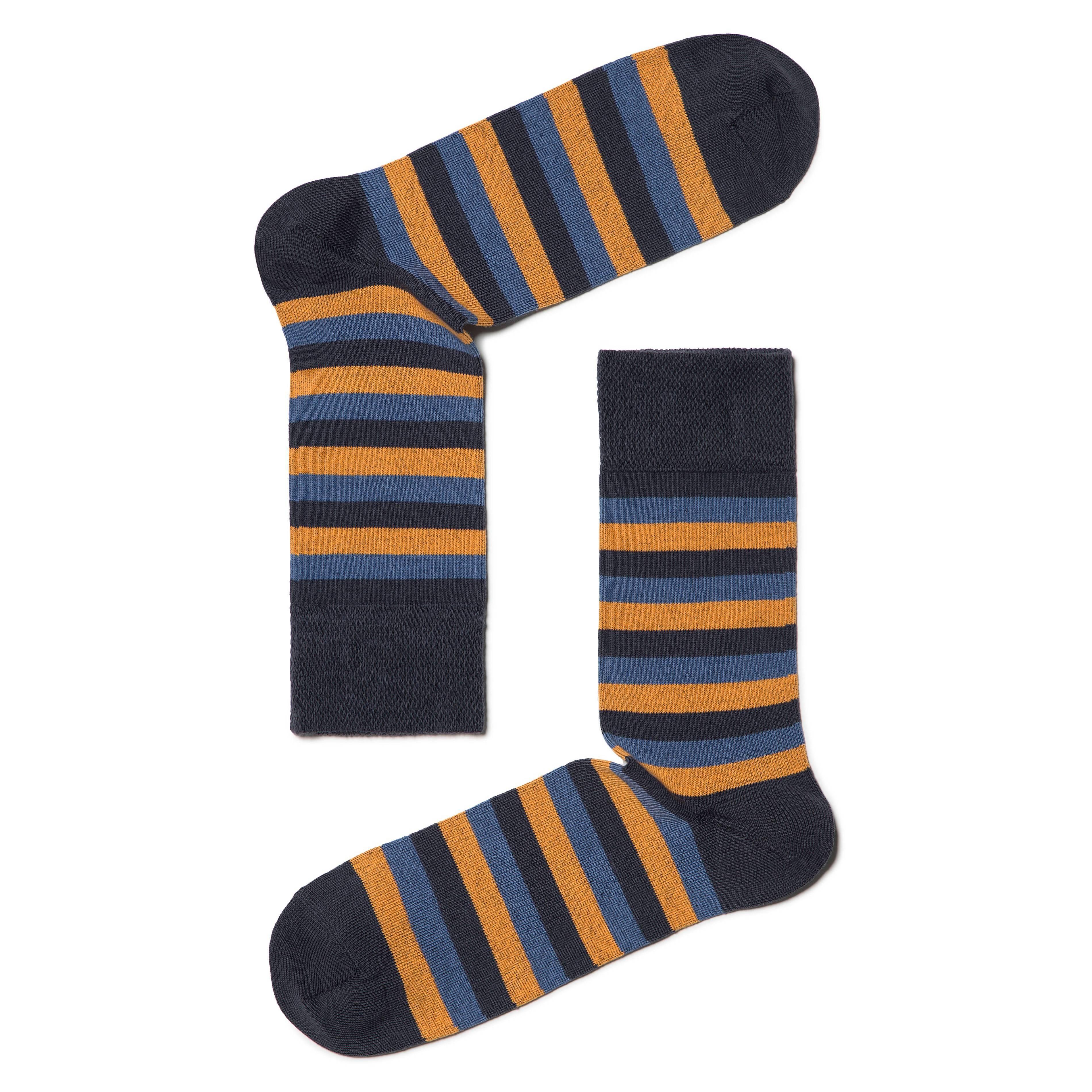 Удобные мужские носки в полоску. Они сделаны из плотного трикотажа и отличаются высокой мягкой резинкой. Носки приятны к телу и хорошо сочетаются с любой одеждой в стиле Casual.