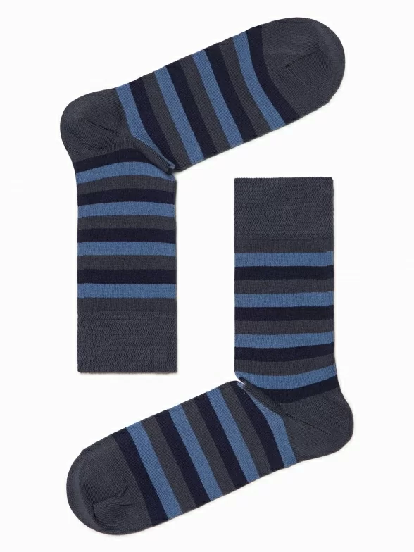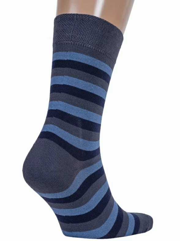 Мужские носки классической длины, связанные из плотного качественного трикотажа с высоким содержанием хлопка. Они очень удобны и приятны к телу, а их расцветка в полоску отлично подходит к одежде в стиле Casual.