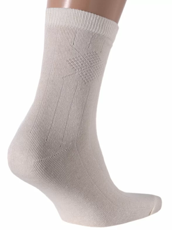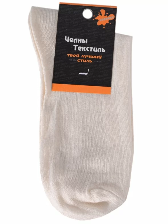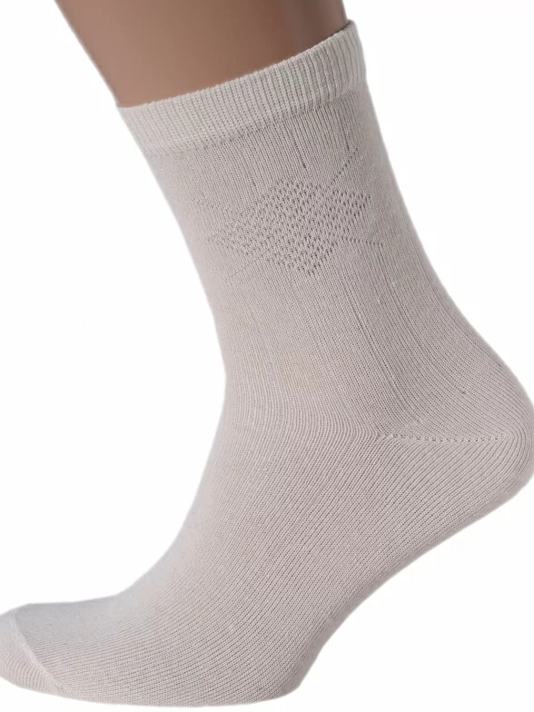 Хлопковые носки для мужчин от бренда Челны Текстиль. Изготовлены на современном оборудовании известной российской фабрики. Состоят на 80% из хлопка. Входящий в состав полиэстер (20%) делает изделие более прочным и износостойким. Носки однотонного бежевого цвета. Украшены узорной вязкой.