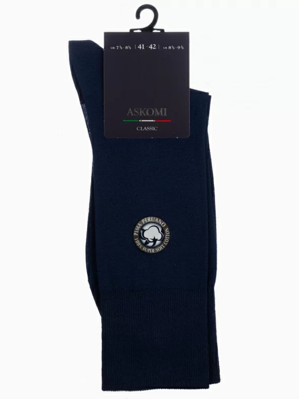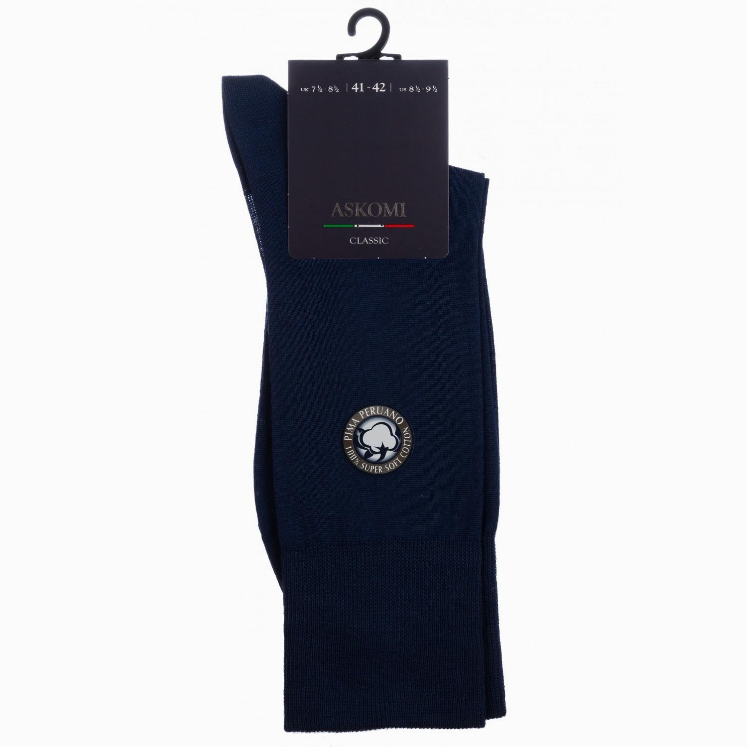 Летние или круглогодичные средней длины мужские носки, цвет темно-синий, классические, шов кеттельный (бесшовная технология), принт (рисунок): без рисунков/узоров, однотонный, состав: 100% хлопок PIMA (перуанский), арт. АМ-7910. Производитель «ASKOMI» Россия под брендом «Askomi».