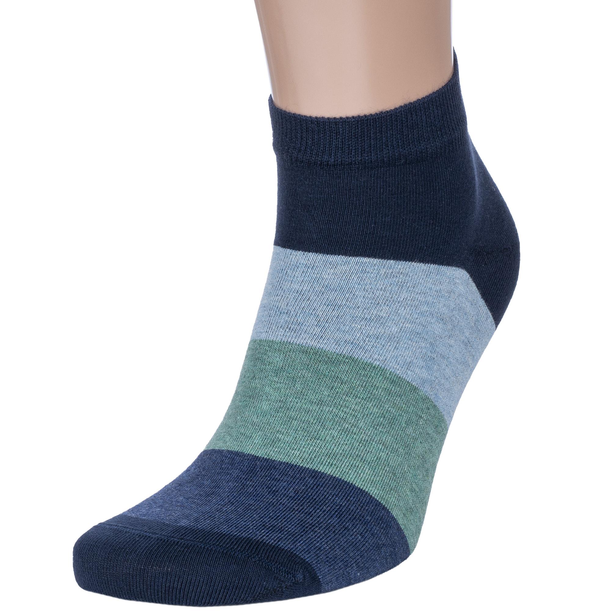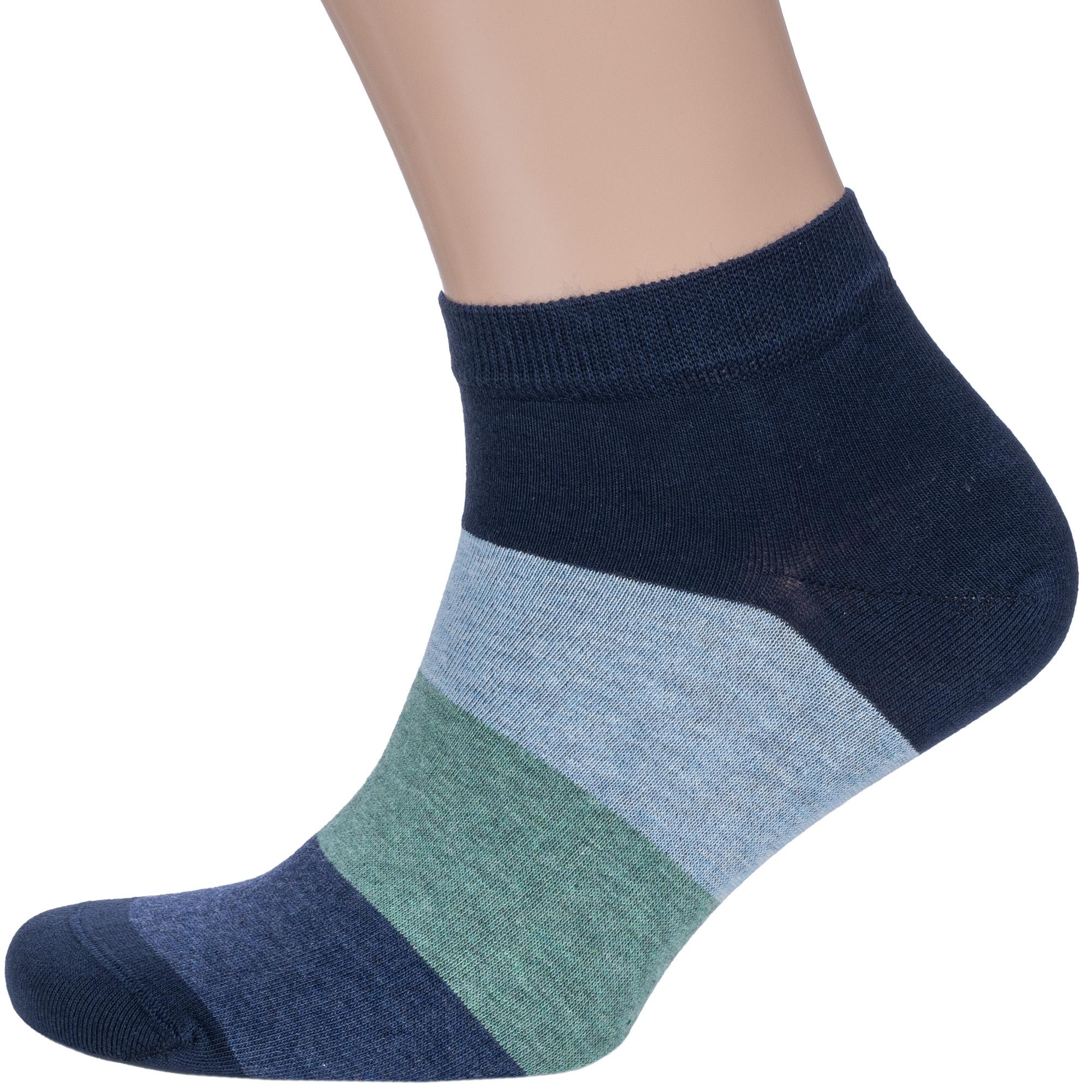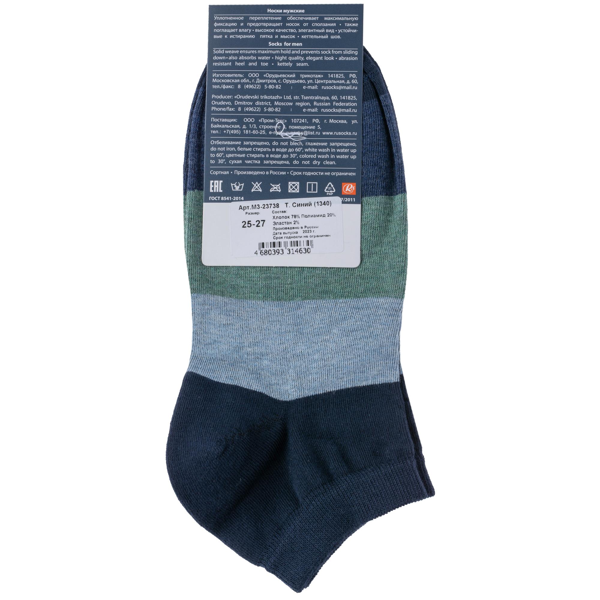 Круглогодичные или летние короткие мужские носки, цвет темно-синий, классические, шов кеттельный (бесшовная технология), принт (рисунок): полоски, с узором, состав: 78% хлопок, 20% полиамид, 2% эластан, арт. М3-23738. Производитель «ООО Орудьевский трикотаж, Россия» под брендом «Rusocks (орудьевский трикотаж)».