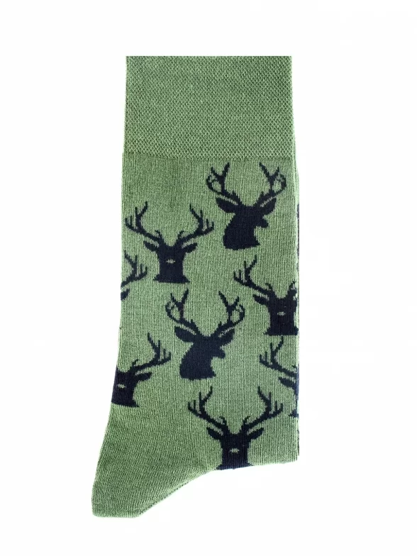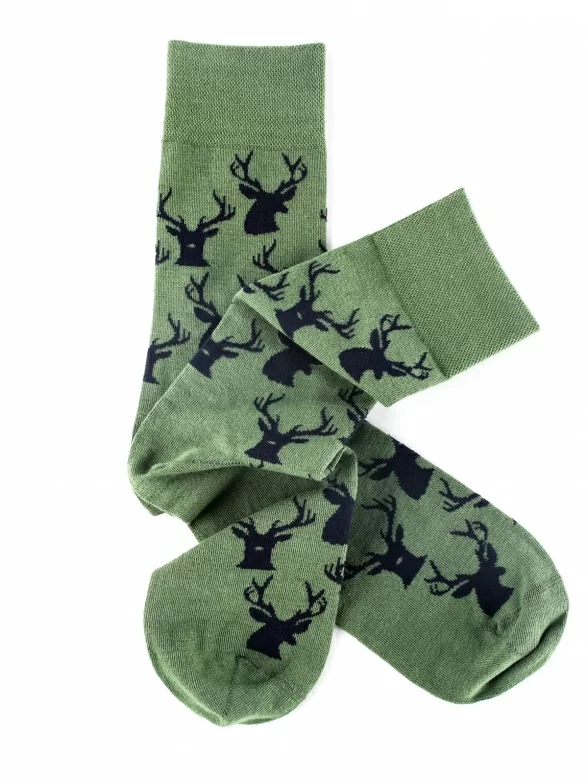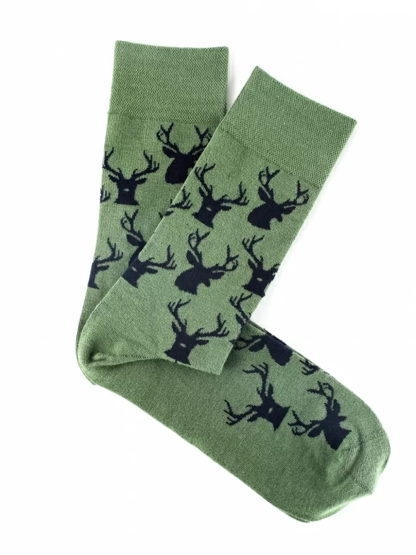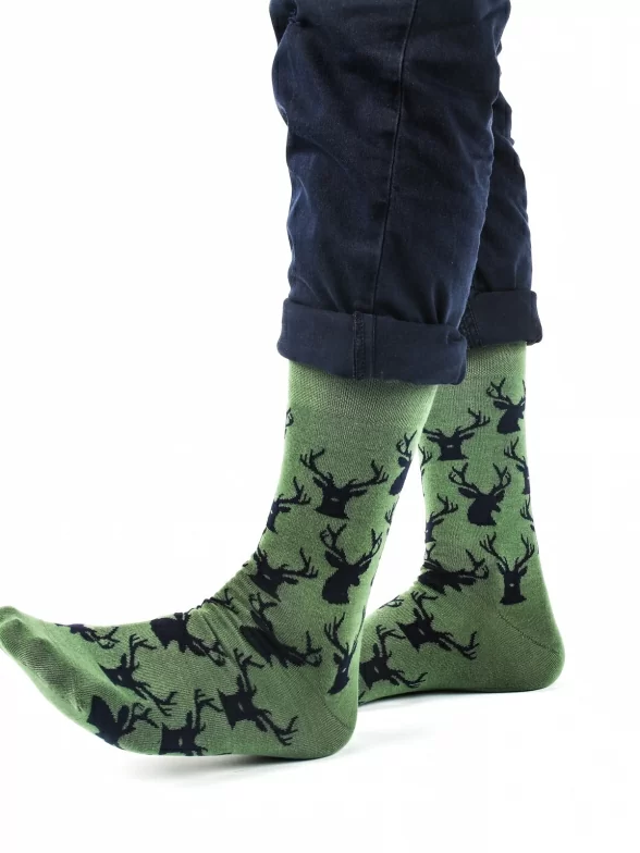 Мужские носки классической длины сделаны из пряжи на основе мягкого хлопка. Модель, дополненная широкой резинкой, украшена принтом в виде оленей.
