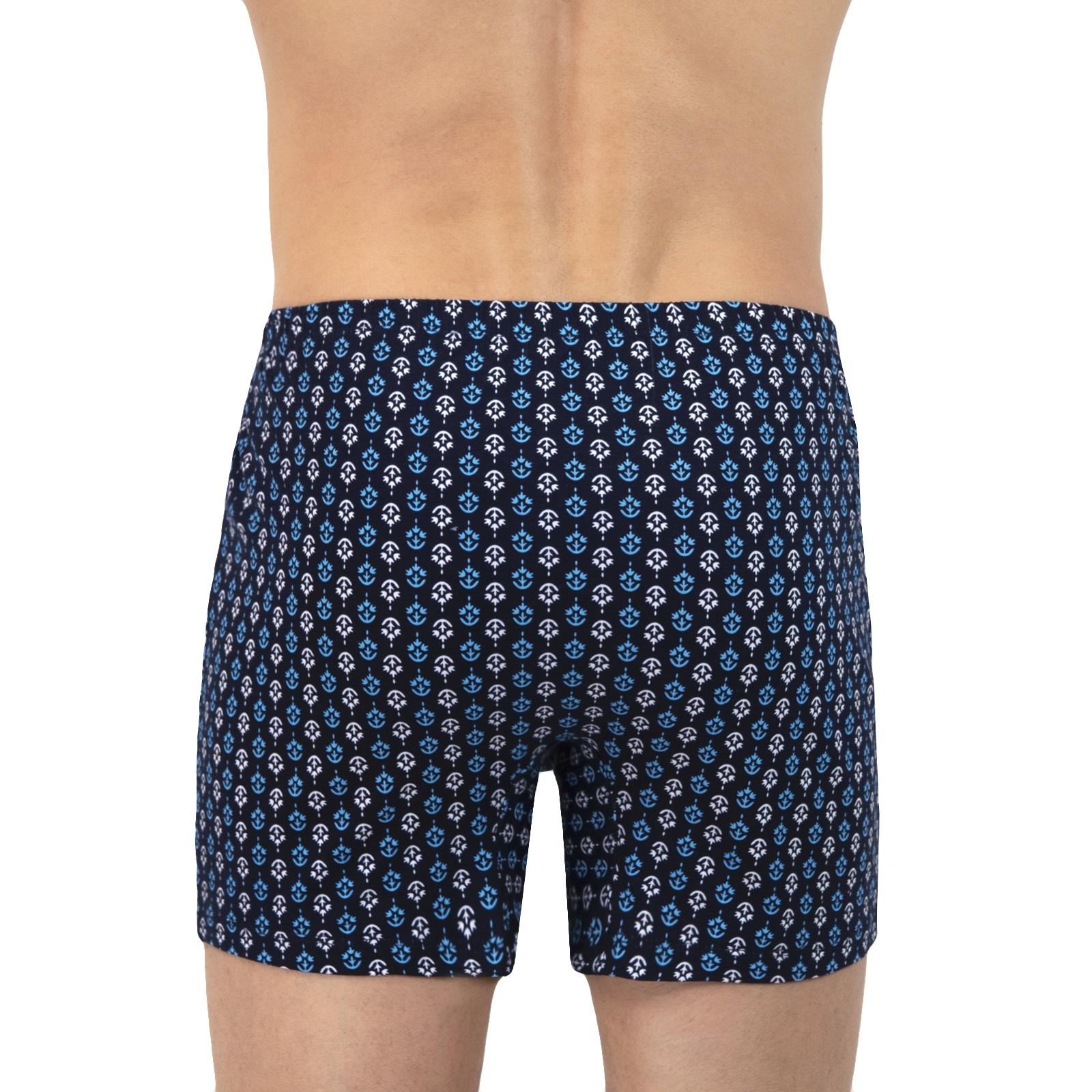 Удобные хлопковые трусы-шорты для мужчин. Материал мягкий, цвет темно-синий, узор - абстрактный. Подходят для ежедневного использования. Широкая резинка удобная и плотная, не перетягивает кожу.