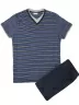 Удобный мужской комплект домашней одежды, состоящий из футболки и брюк. Футболка с V-образным вырезом дополнена декоративной контрастной планкой и оформлена контрастной полоской. Однотонные брюки свободного кроя отличаются удобным поясом на резинке.