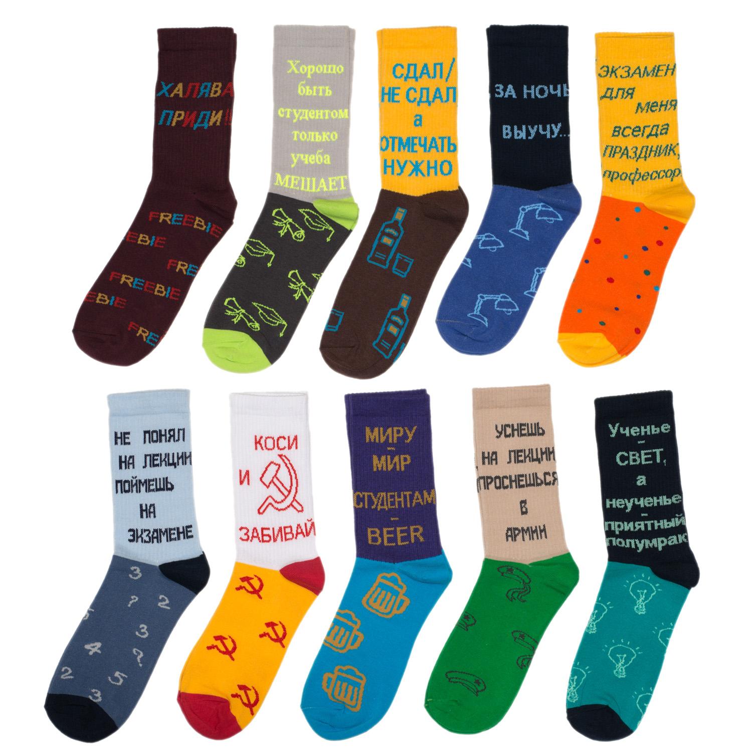 Самые стильные, самые популярные, самые молодежные носки бренда MSCLUB. Студенческая коллекция с прикольными принтами и надписями, такими как "Коси и забивай", "Миру-мир, студентам - beer", "Не понял на лекции, поймешь на экзамене", "Уснешь на лекции, проснешься в армии" и другие! Носки связаны на известной российской фабрике МС Клаб c использованием современного оборудования. В наборе 10 пар носков. Носки состоят на 82% из хлопка - они в меру плотные, износостойкие и очень эластичные. Не теряют свою форму и цвет после многочисленных стирок. Удобная резинка не пережимает ногу в течение всего дня. Носки компактно упакованы в стильный пакет.