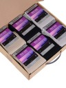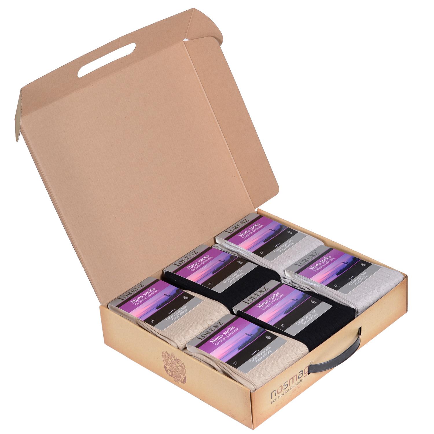 Набор состоит из 18 пар носков арт. Е40: 12 пар черных, по 3 пары бежевых и серых. Все носки с индивидуальными фабричными этикетками сложены в фирменный кейс, который дополнительно упакован в плотный транспортный картон для сохранности при доставке.