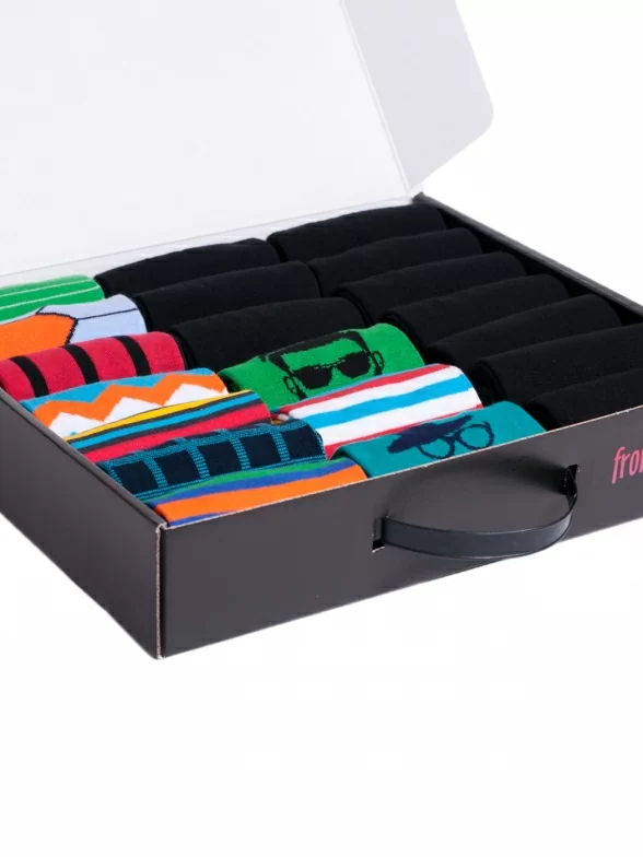 Носки компактно свернуты в аккуратные рулончики внутри красивого фирменного кейса с пластиковой ручкой. Для сохранности внешнего вида при транспортировке набор упаковывается в плотный картон.