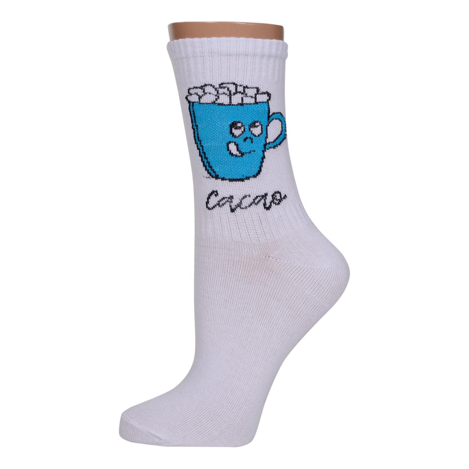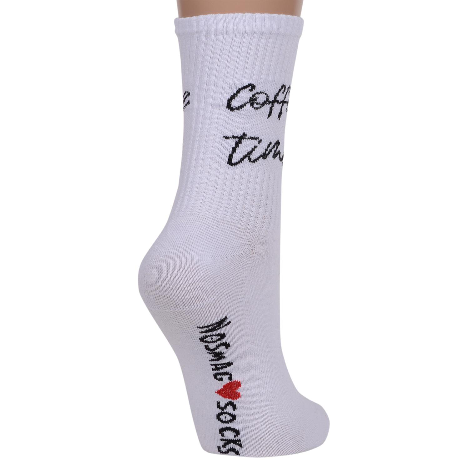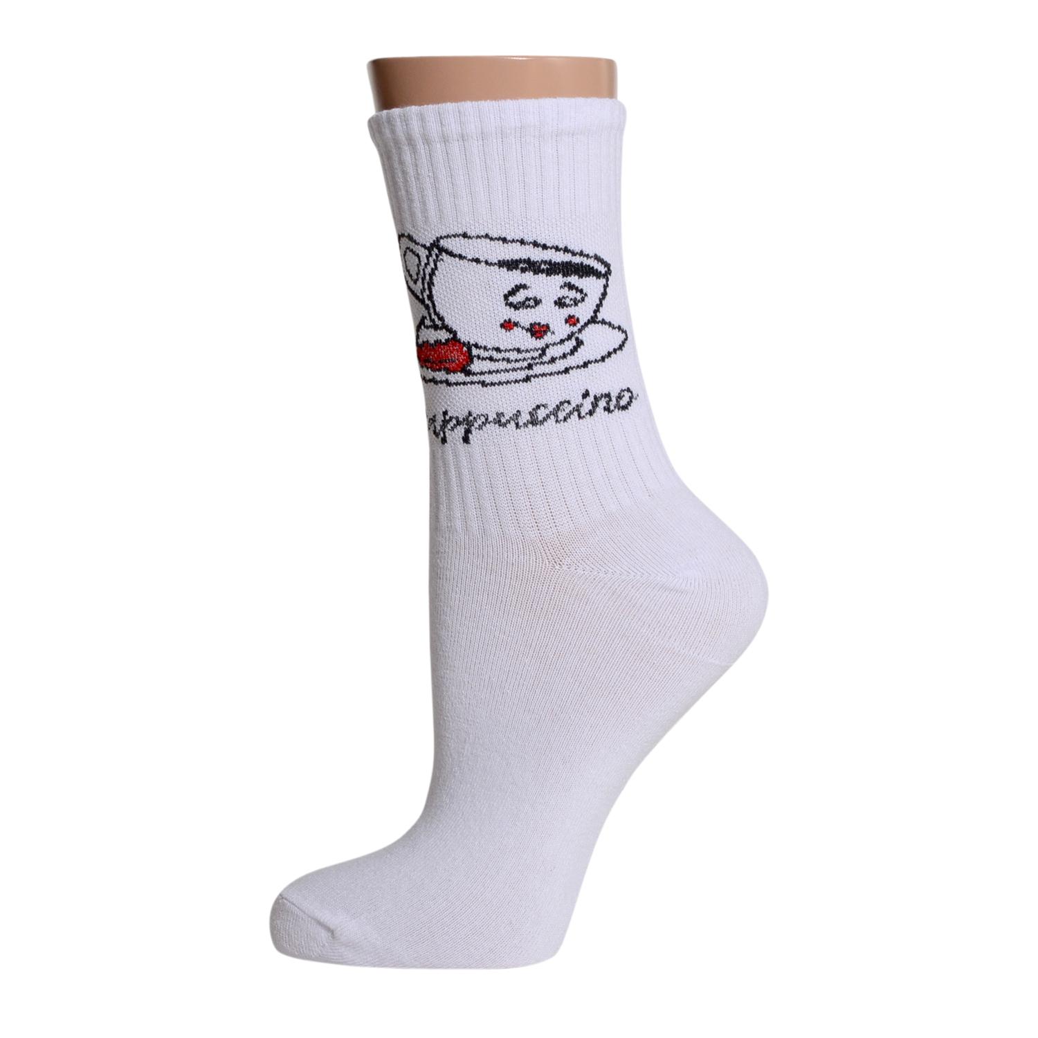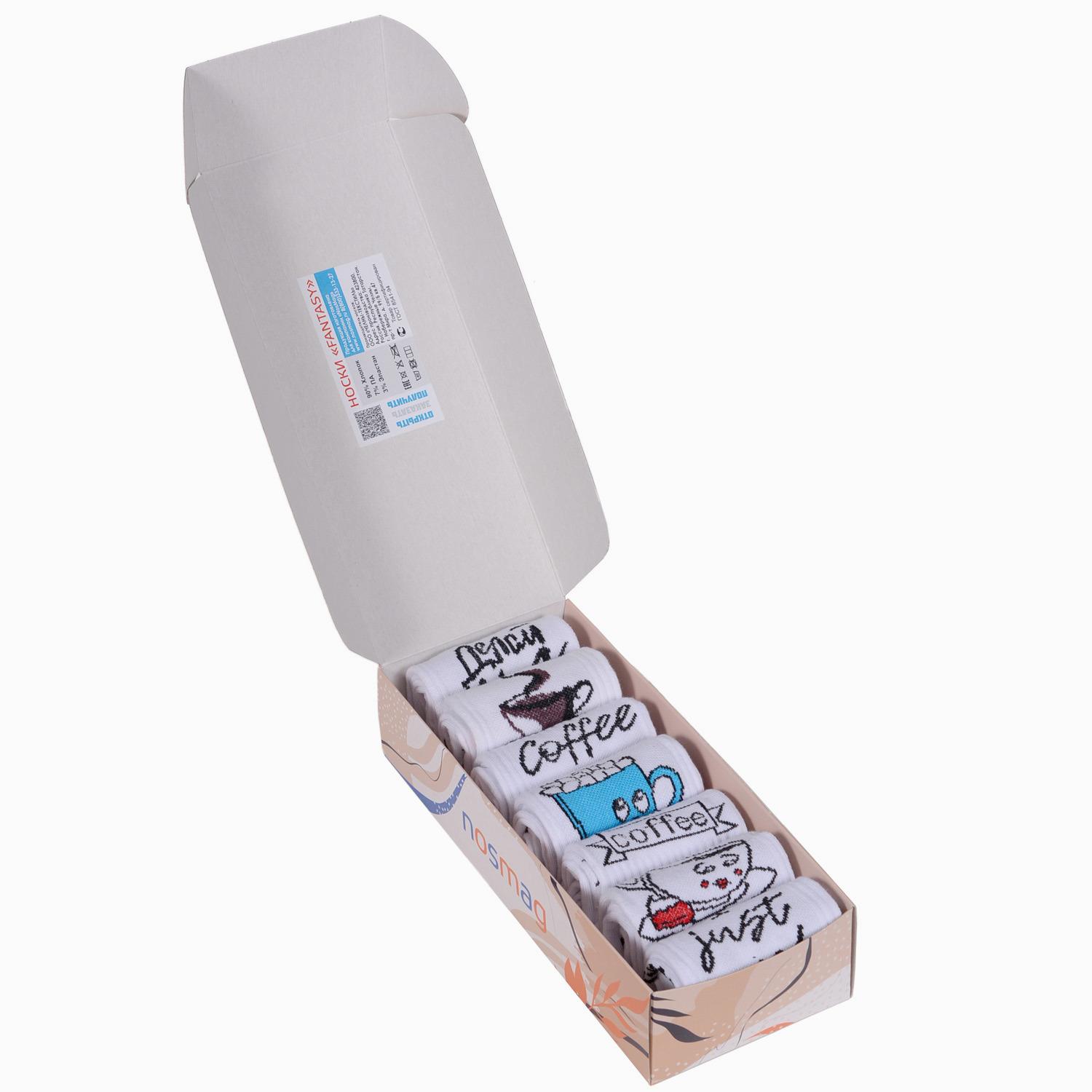 Набор из 7 пар женских белых носков, оформленных яркими рисунками и надписями.