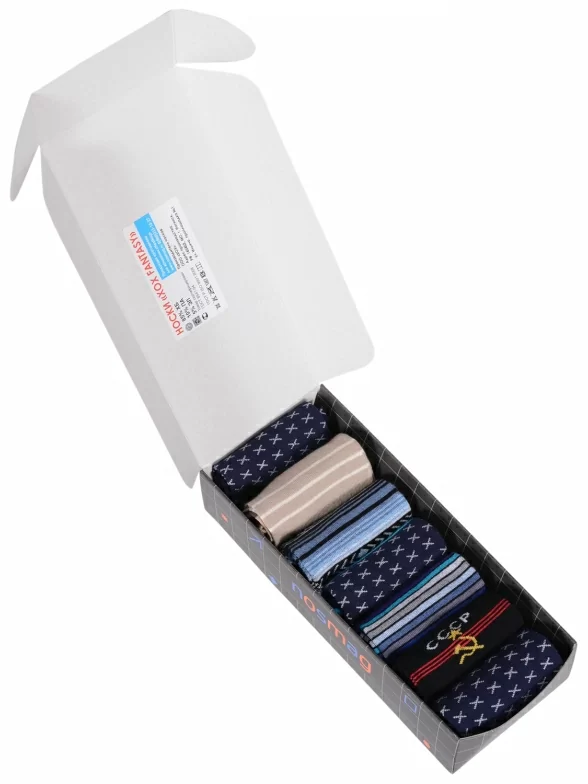 Носки аккуратными рулончиками без фабричных этикеток упакованы в фирменную подарочную коробку.