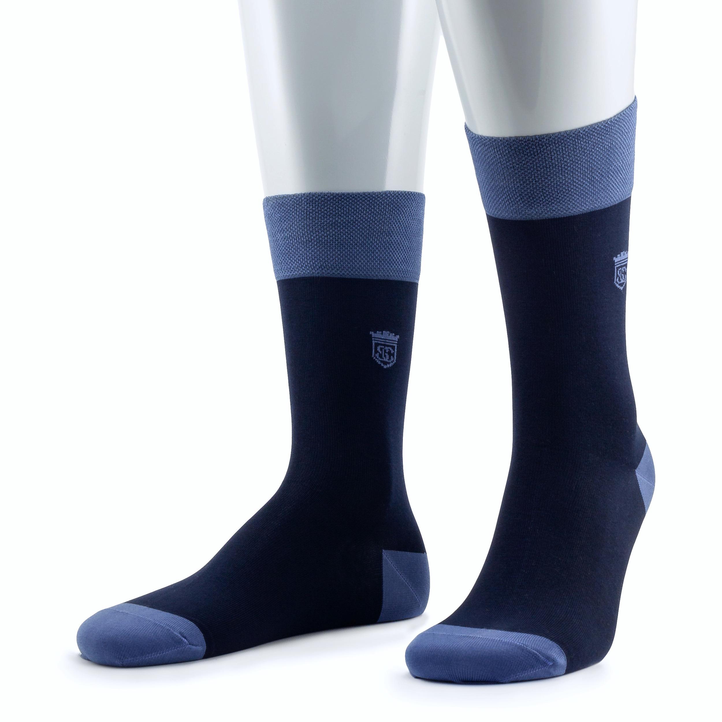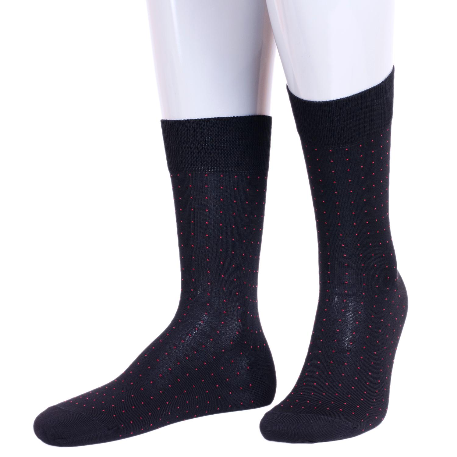 - По 1 паре синего, черно-серого и черно-красного цветов артикула 18SC1. Модель средней длины с двойным бортом (манжетом резинки) и плоским малоощутимым швом на мыске; оформлена узором в мелкую точку.