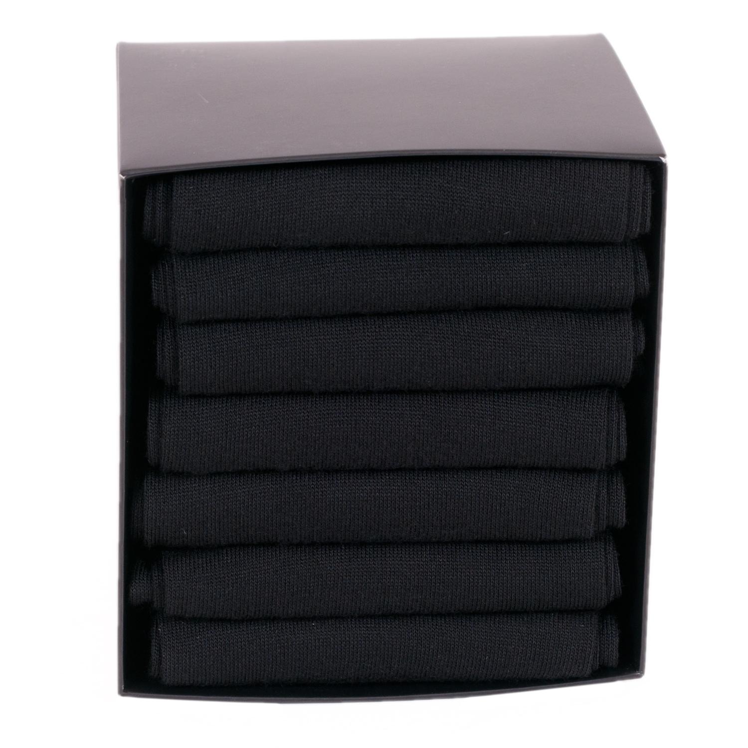 Набор состоит из 7 пар черных носков артикула 15D7, сложенных с индивидуальными фабричными этикетками в фирменную коробку-кубик, которая дополнительно упакована в плотный транспортный картон для сохранности при доставке.