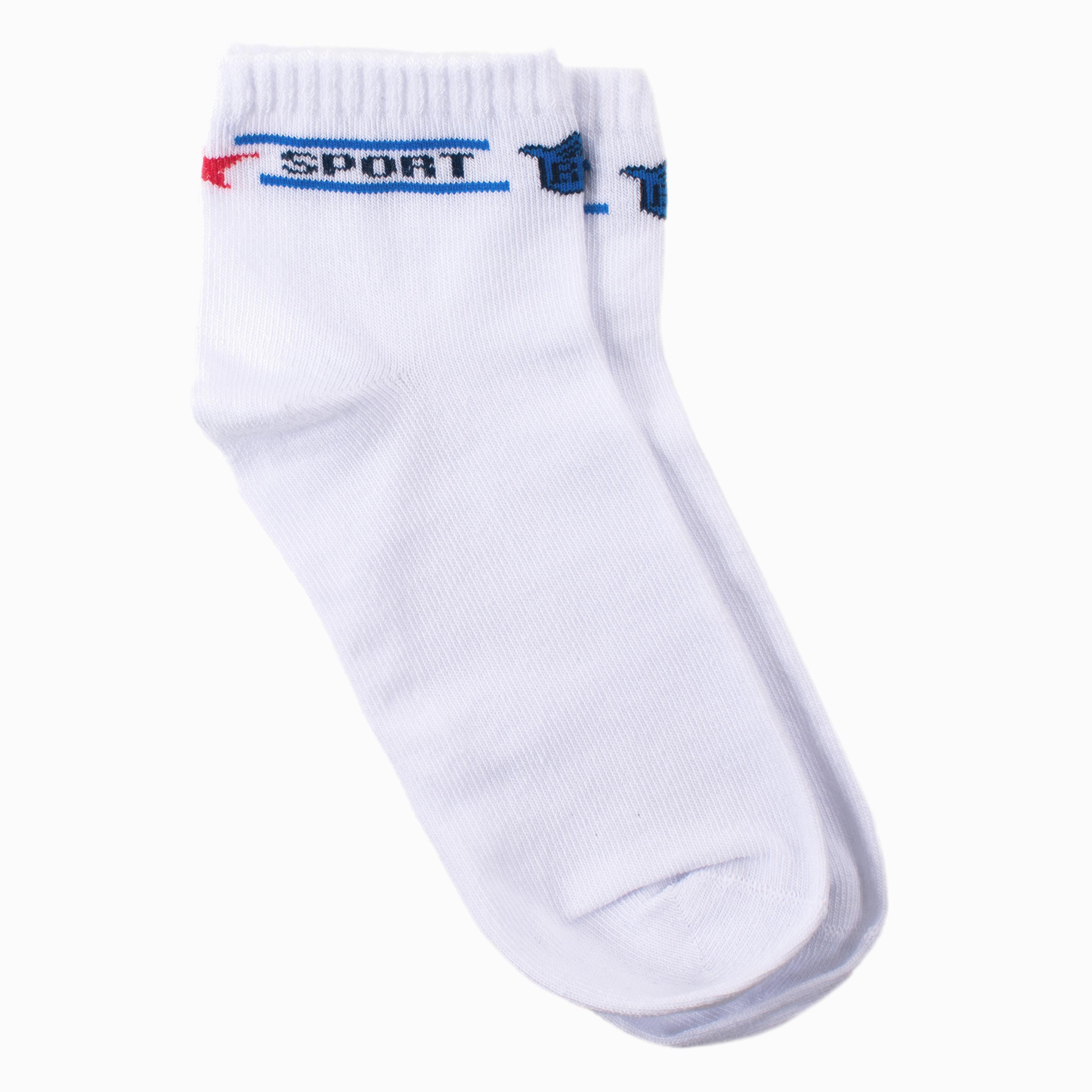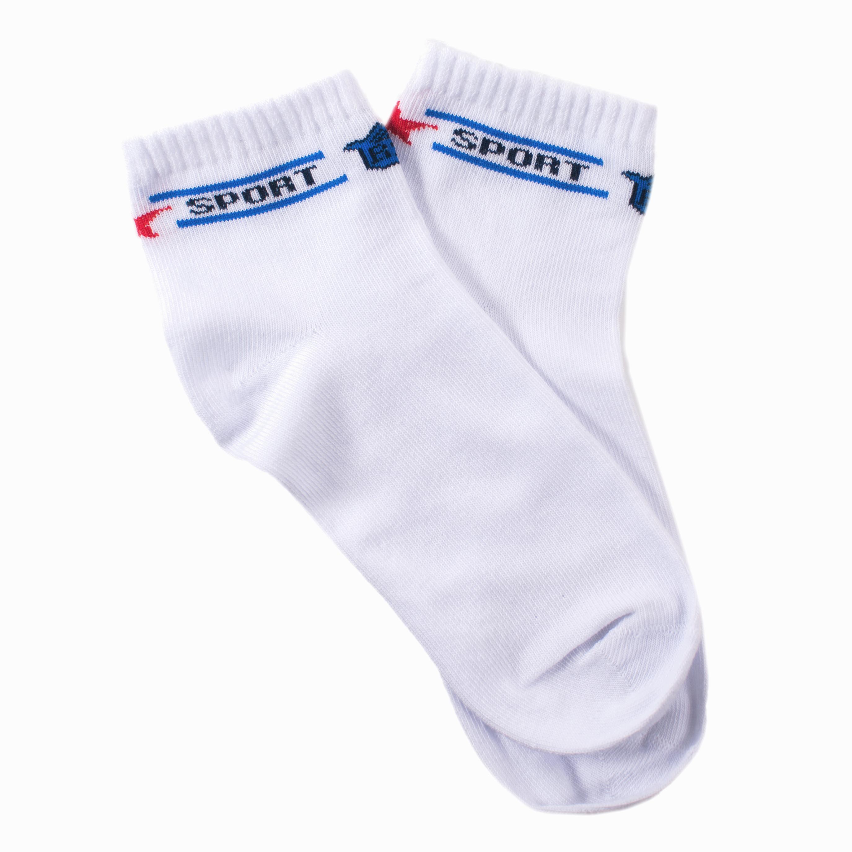 Удобные детские носки укороченной длины. Модель представлена в белом цвете с синей надписью SPORT. Носки сделаны из 80% мягкого хлопка, хорошо тянутся и позволяют коже дышать. Эластичная резинка не перетягивает ногу.