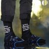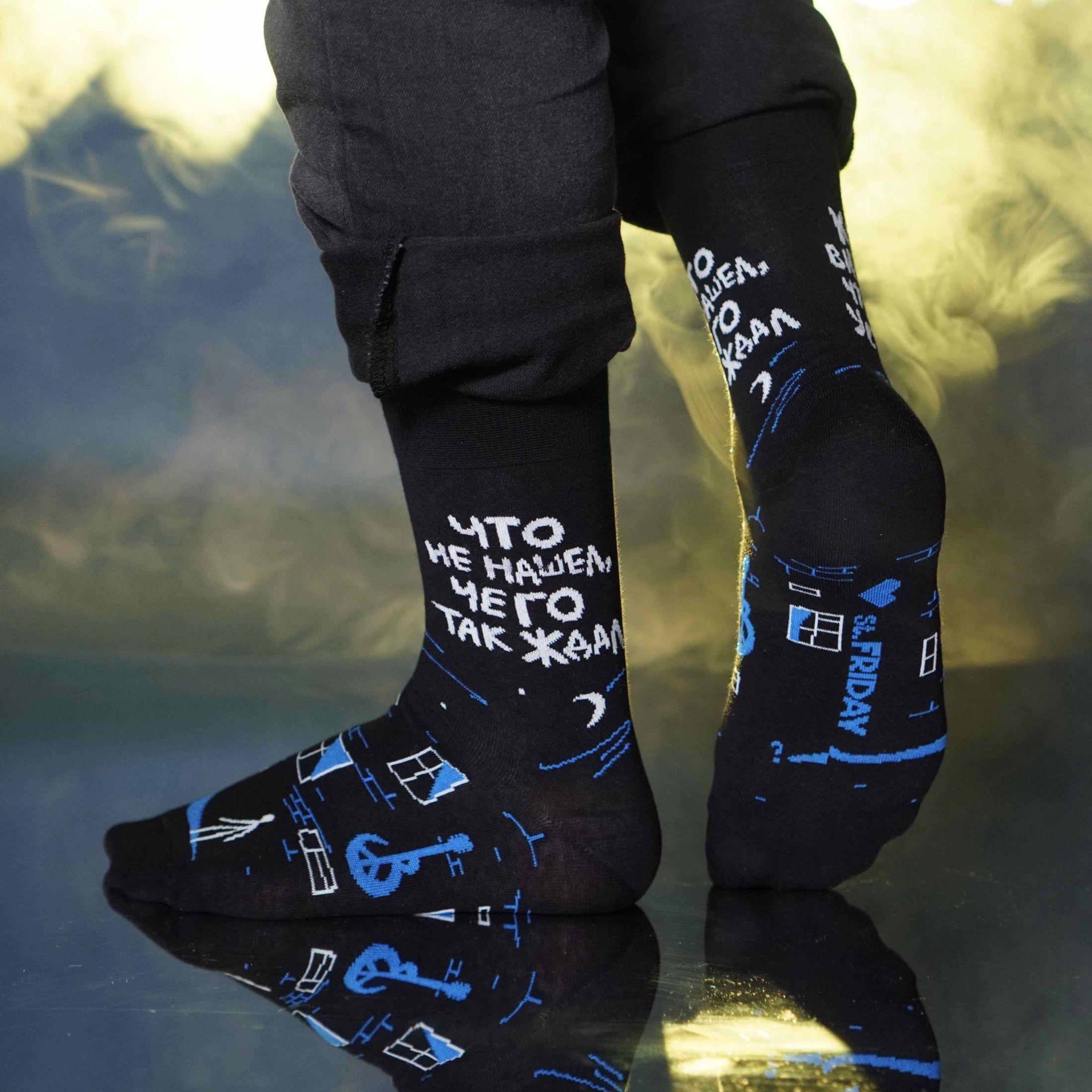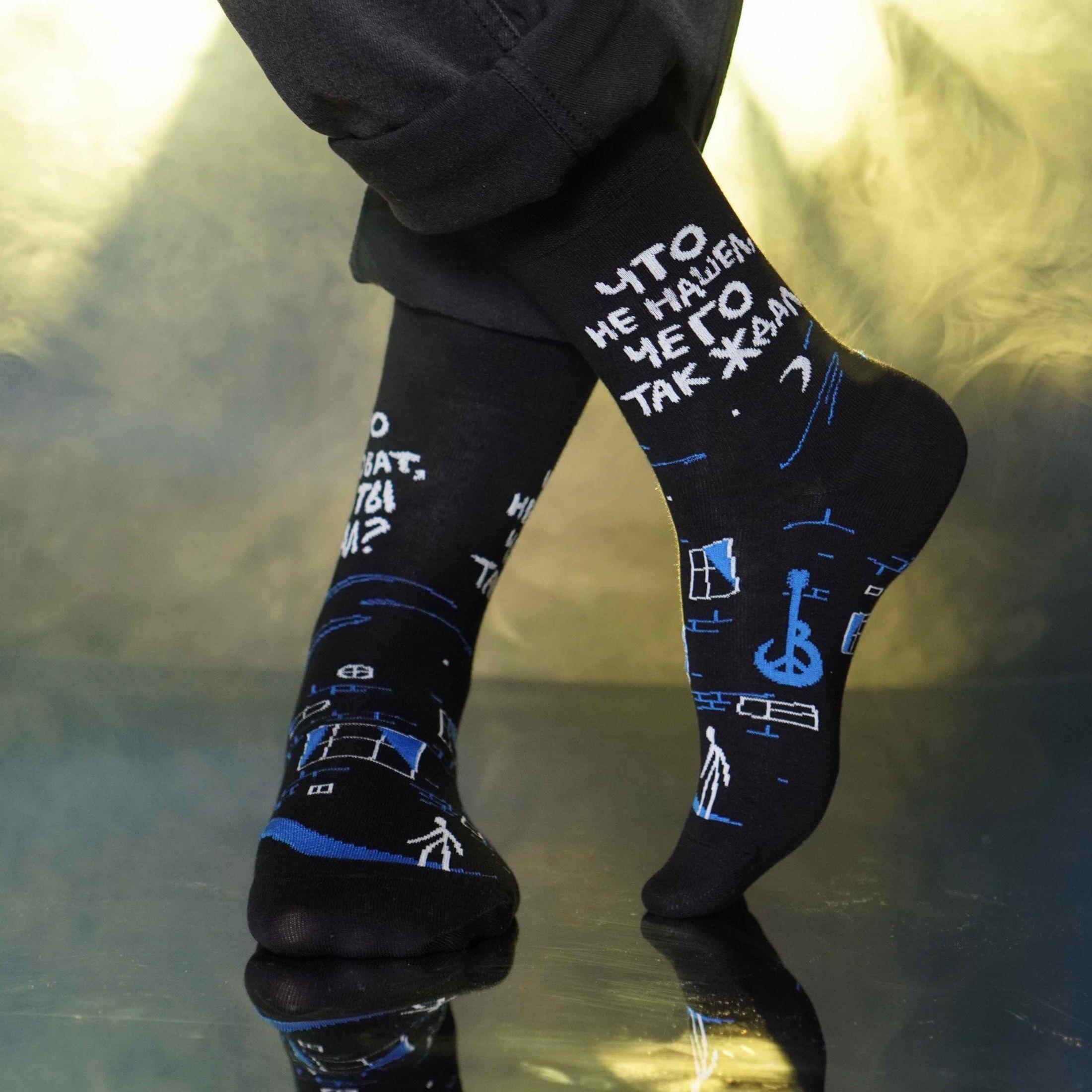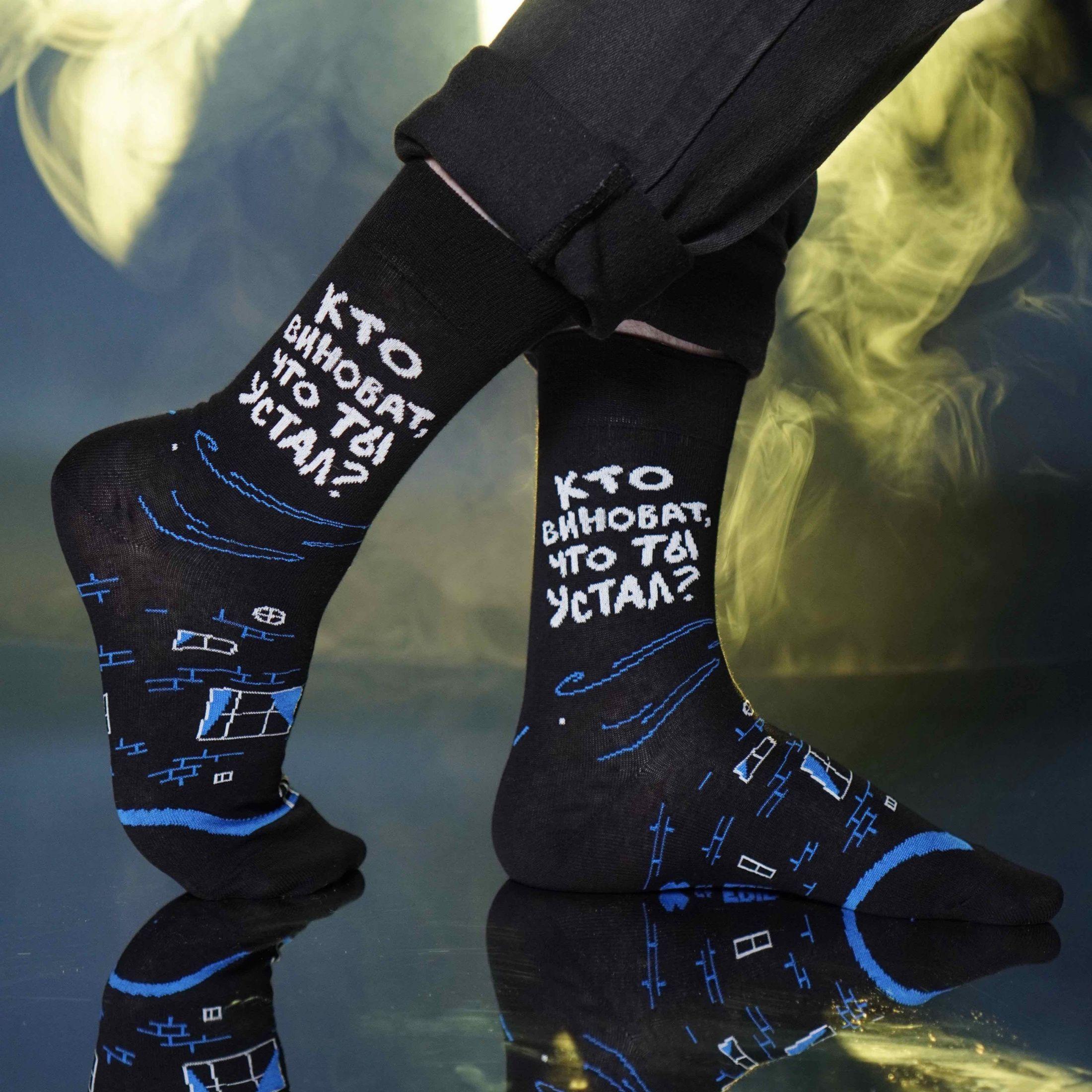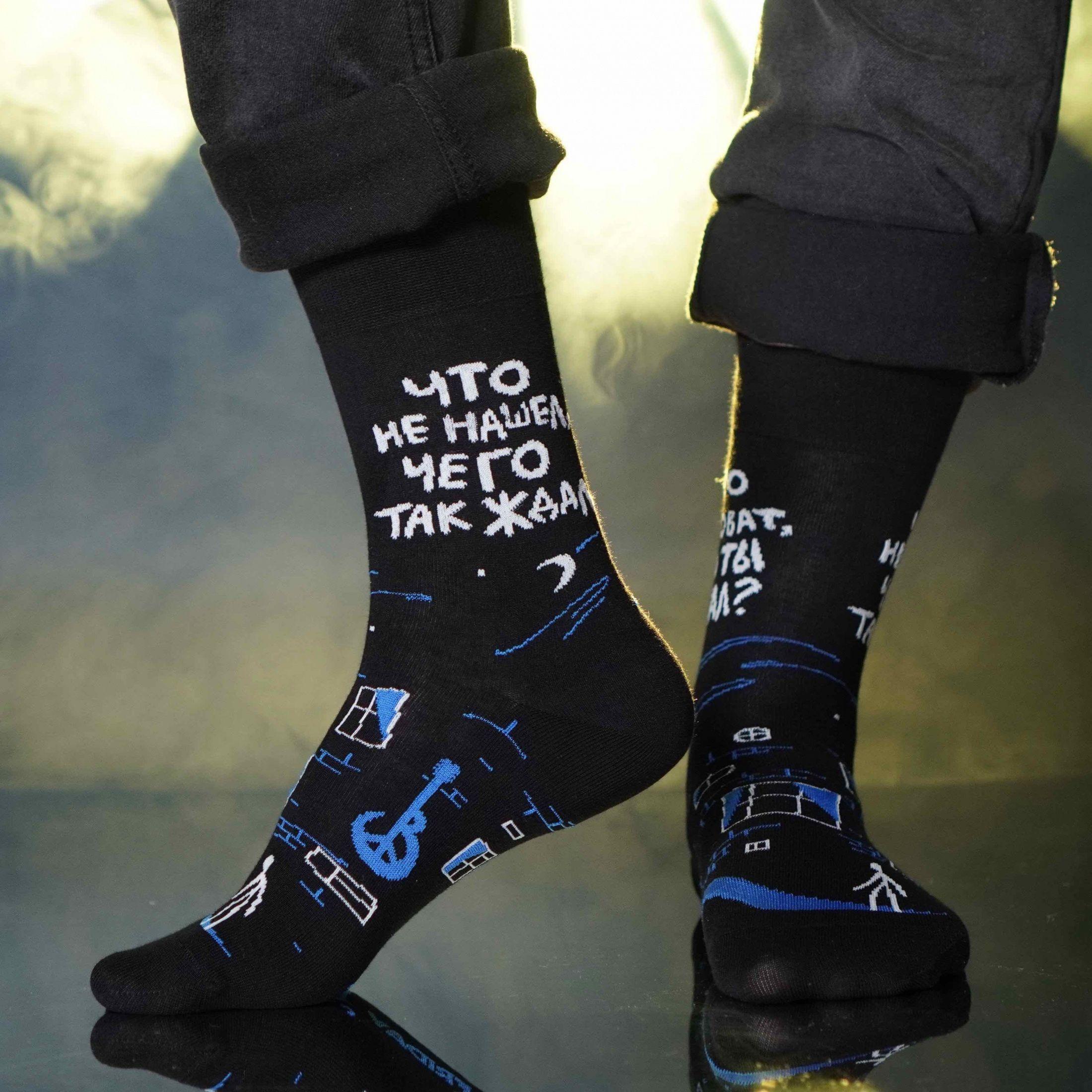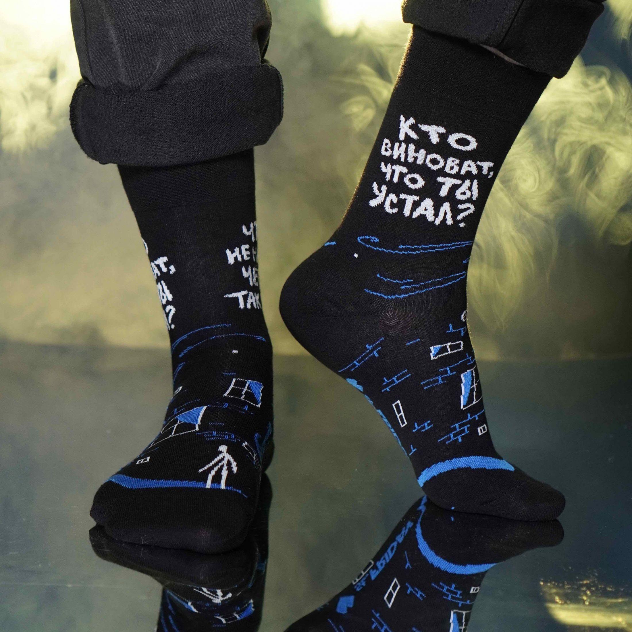 Носки унисекс с принтом в виде ночного городского пейзажа и фразами по мотивам песни группы "Воскресение" в рамках ностальгической коллекции "Русский рок". На разных носках в паре своя надпись - "Кто виноват, что ты устал?" и "Что не нашел, чего так ждал".