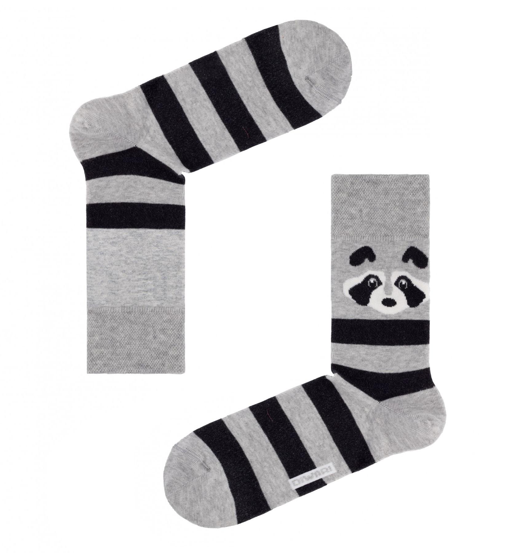 Необычные фантазийные носки, оформленные полосками и мордочкой енота. Модель классической длины с двойным бортом и неощутимым швом на мыске.