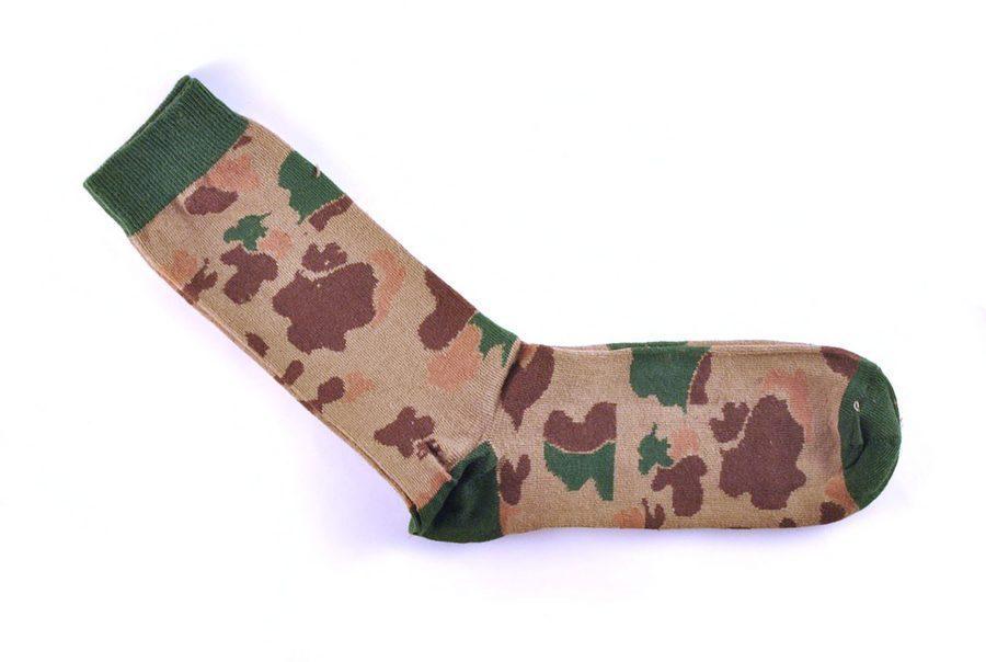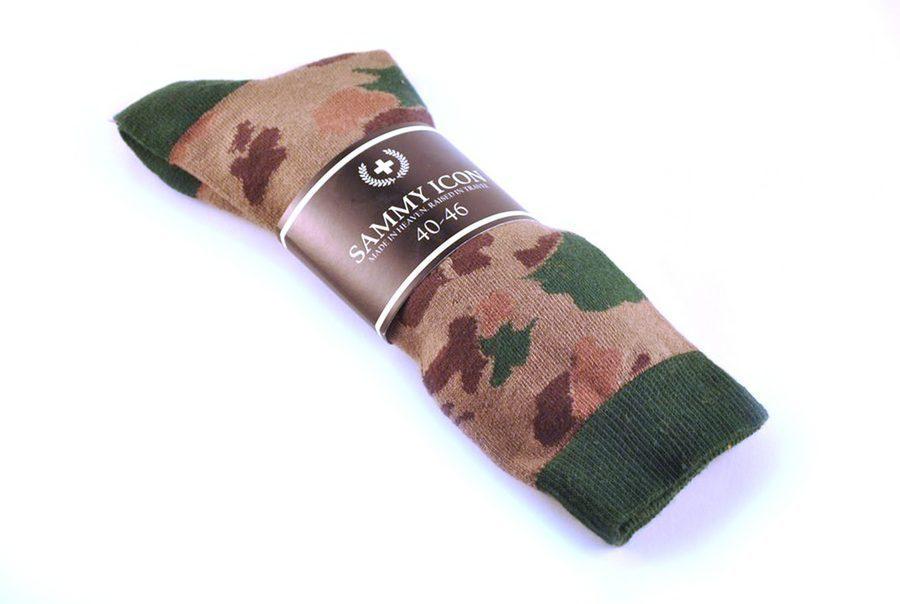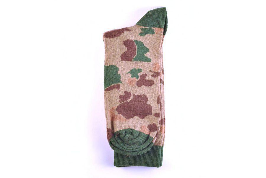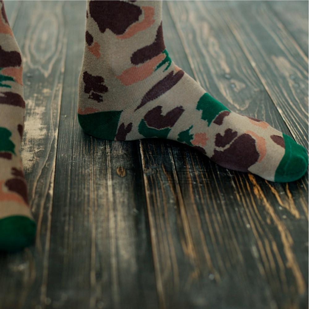 Носки, украшенные камуфляжным принтом, сделаны из пряжи на основе индийского эко-хлопка. Модель дополнена контрастными пяткой, мыском и широкой резинкой.