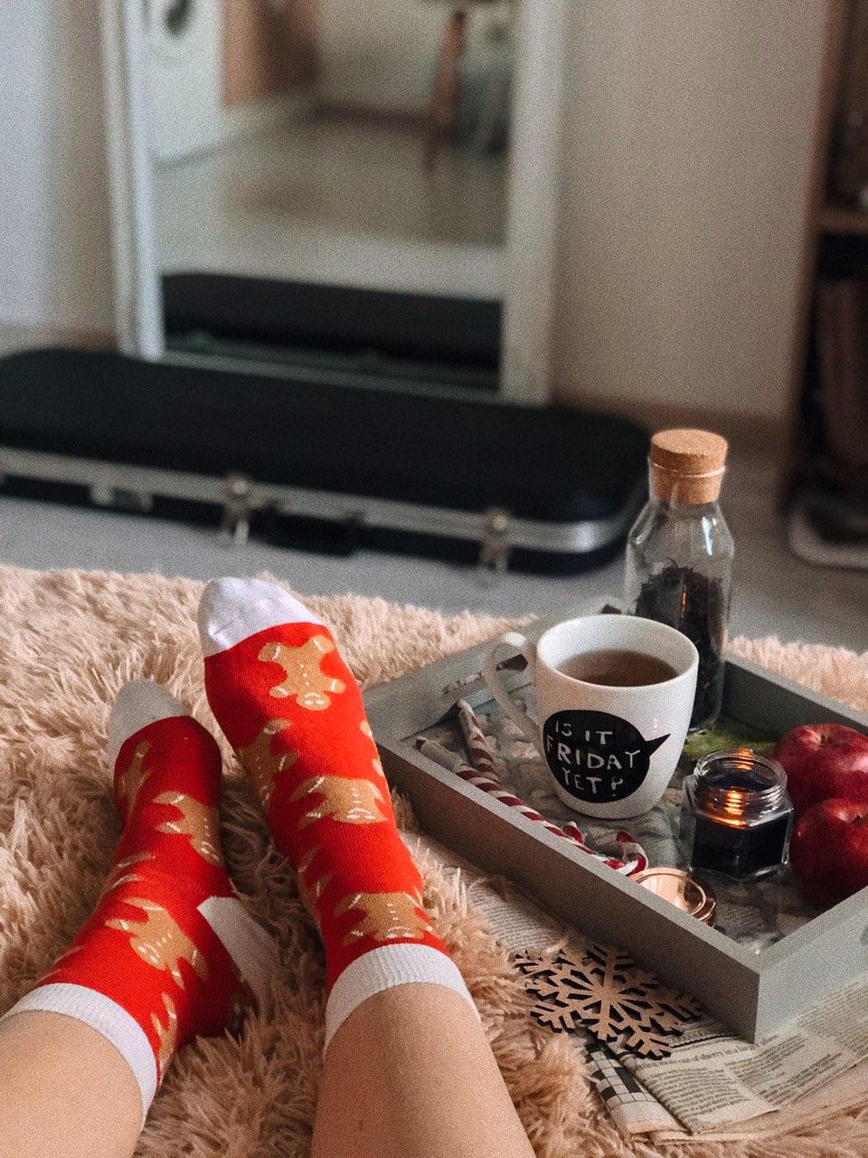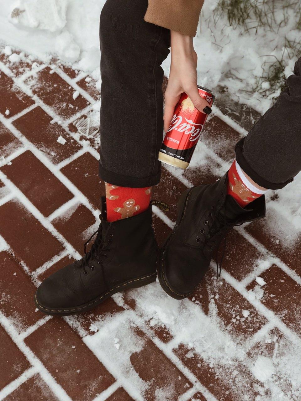 Носки украшены рисунком в виде пряничных человечков. Модель от Sammy Icon связана из пряжи основе индийского хлопка. Пятка, мысок и широкая резинка сделаны из нитей контрастного цвета.