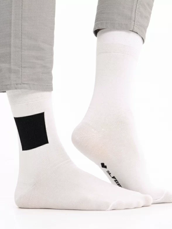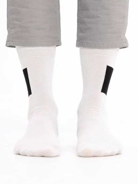 Модель средней длины с двойным бортом (манжетом резинки) и с обычным швом на мыске - с ощутимым уплотнением. Пара таких носков с индивидуальной фабричной этикеткой поставляется в плотном транспортном пакете.