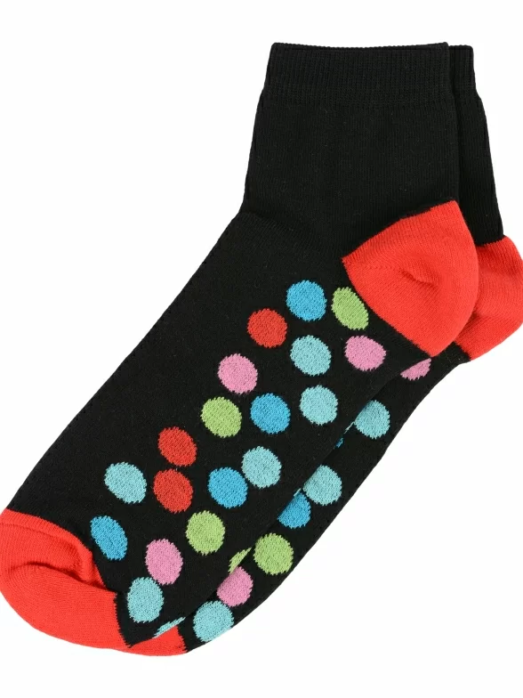 Укороченные женские носки, оформленные принтом в разноцветный крупный горох на подошве и контрастными яркими деталями. Они сделаны из качественного хлопкового трикотажа, очень удобны, и отлично подходят под низкую обувь.
