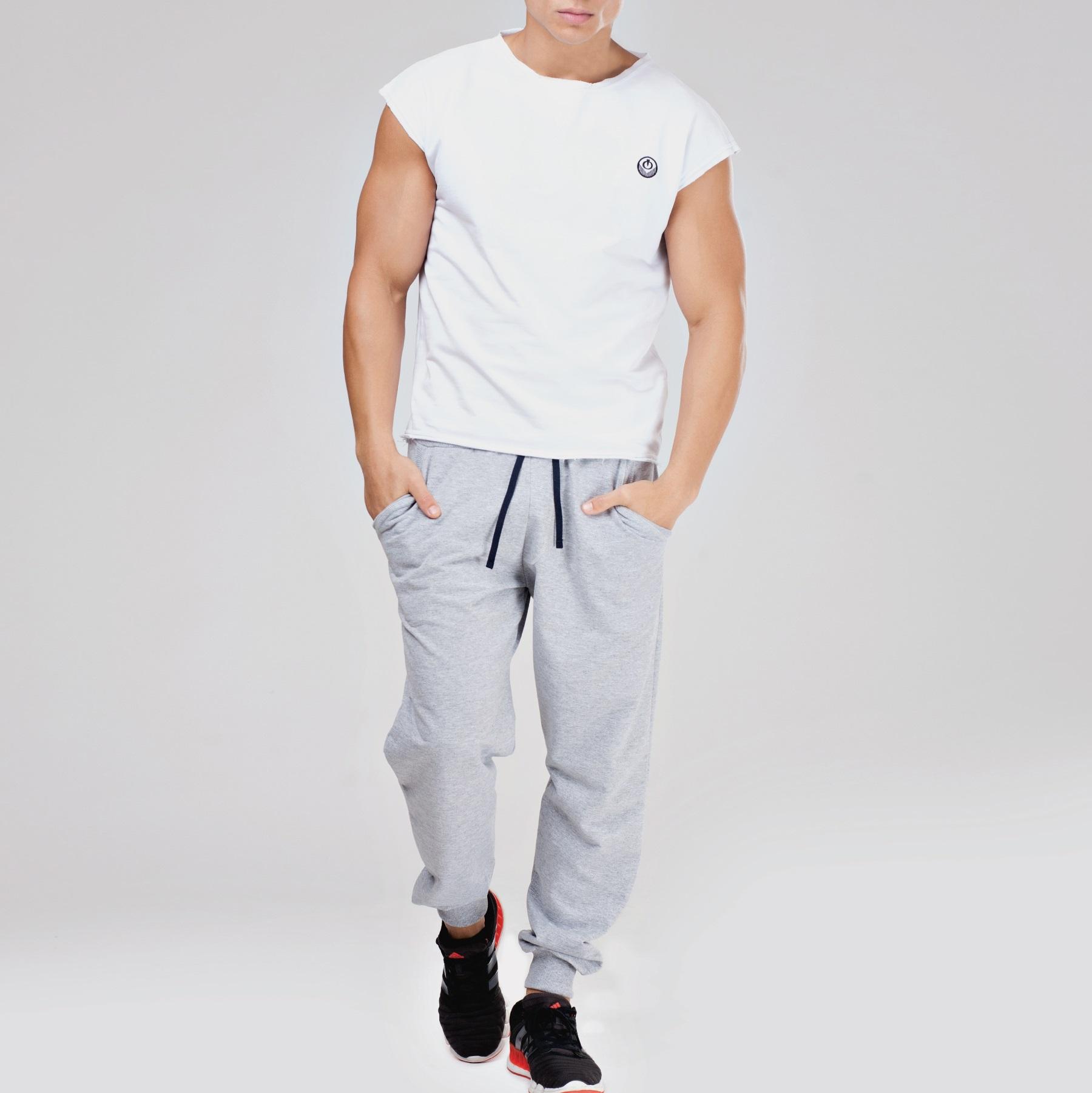 Удобные мужские брюки в спортивном стиле, сделанные из приятного трикотажа в меланжевой расцветке. Они отлично подойдут как для дома, так и для спортзала. Кромки карманов, низ и пояс сделаны из трикотажа в рубчик. Шнурки на поясе позволяют регулировать посадку.