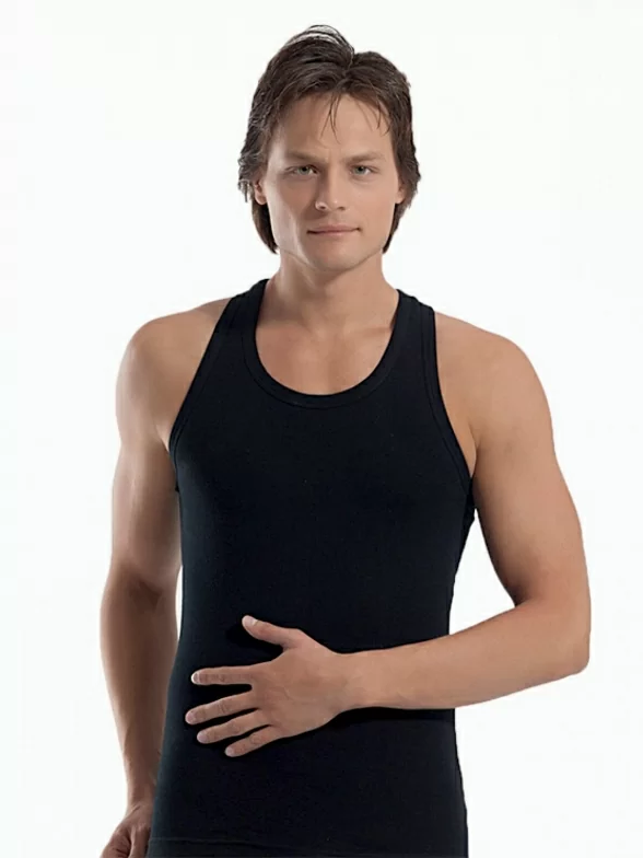 Мужская облегающая майка-борцовка сделана турецким производителем Oztas. Модель с круглым вырезом гороловины и широкими лямками сделана из хлопка.