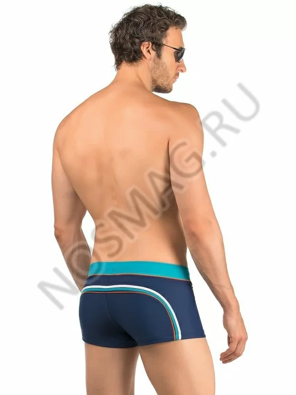 Мужские плавки анатомического кроя в сине-бирюзовом цвете с яркими окантовками и с потайным шнурком.