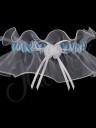 Очень стильная подвязка из шифона с фигурной обработкой краев. Она оформлена контрастной атласной лентой и репсовым бантиком с импровизированными розочками.