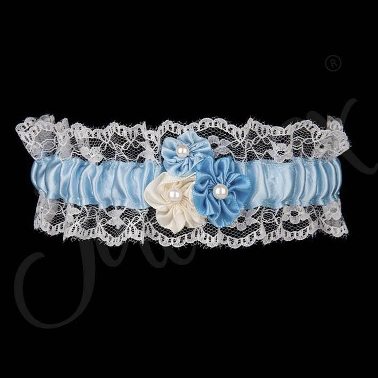 Красивая атласная подвязка, декорированная кружевом и эффектными цветочками с бусинами. Нежные цвета и милая композиция отлично дополняют друг друга.